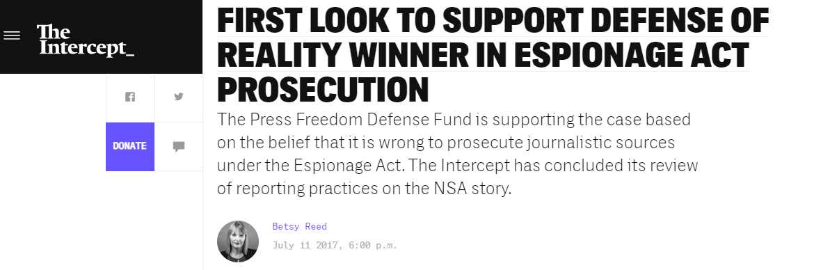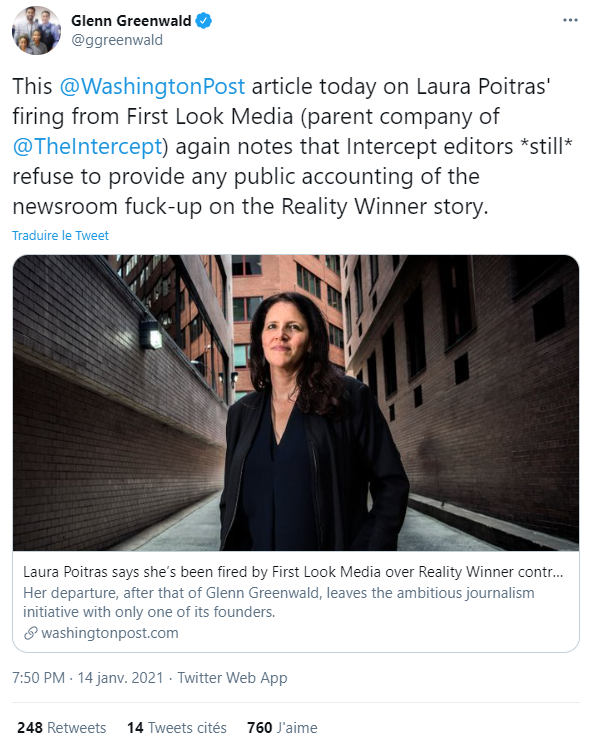 Dans un tweet posté le même jour, Glenn Greenwald prenait lui aussi la défense de Laura Poitras, notant que "les rédacteurs en chef de The Intercept refusent *toujours* [sic] de prendre leurs responsabilités dans le gâchis qu'est l'affaire Reality Winner." Lui aussi disait avoir passé "des mois" aux côtés de Poitras à demander des comptes et notait "le rôle-clé" qu'avaient joué Betsy Reed et un autre journaliste, Roger Hodge, dans cette "débâcle".