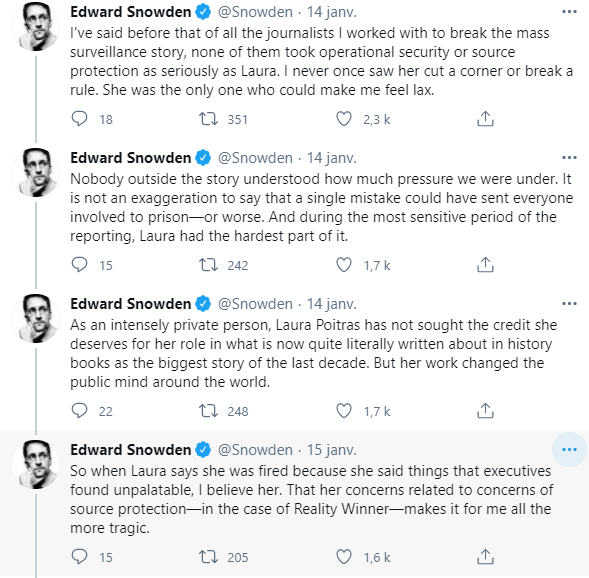 "De tous les journalistes avec qui j'ai travaillé sur le cas de la surveillance de masse [de la NSA], aucun ne prenait autant au sérieux notre sécurité opérationnelle et la protection des sources que Laura. Je ne l'ai jamais vue prendre un raccourci ou violer une règle, ne serait-ce qu'une fois. C'était la seule qui me faisait me sentir laxiste." Saluant le sérieux et la modestie de Poitras, une "personne très réservée" dont le travail "a changé l'opinion publique autour du monde", Snowden a déclaré : "Alors, quand Laura dit qu'elle a été virée parce qu'elle a dit des choses qui ont déplu aux dirigeants d'entreprise, je la crois."