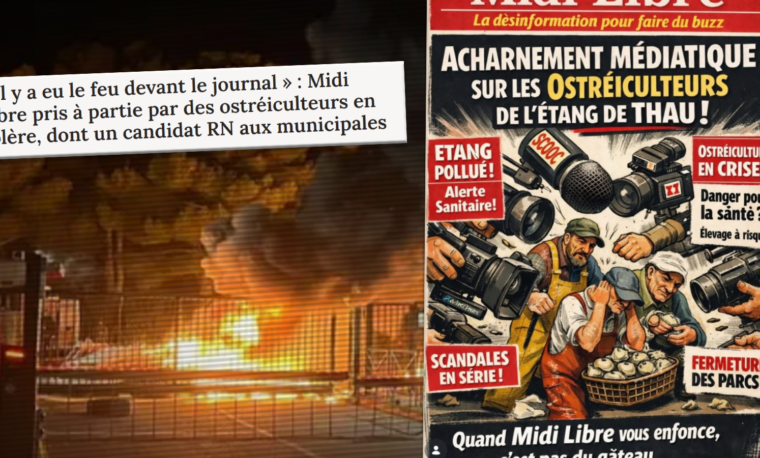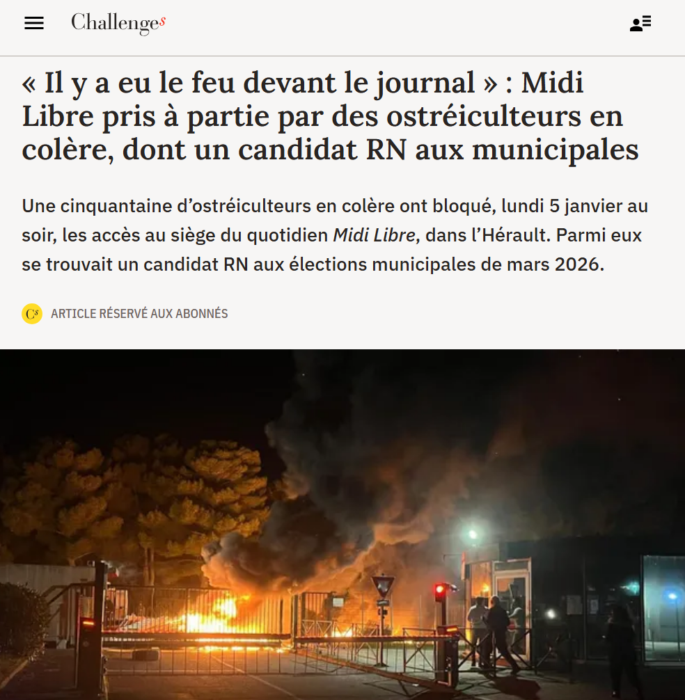 La critique des médias peut-elle se traduire par le siège des bureaux d'un média ? Le 5 janvier, la réponse a été oui concernant le quotidien Midi Libre, pour certains ostréiculteurs de l'étang de Thau –dont un candidat RN aux municipales. La raison ? "Le traitement considéré comme «à charge» des journalistes de MidiLibre sur la suspension de la commercialisation des coquillages de l'étang de Thau", expose un article fouillé de Challenges.