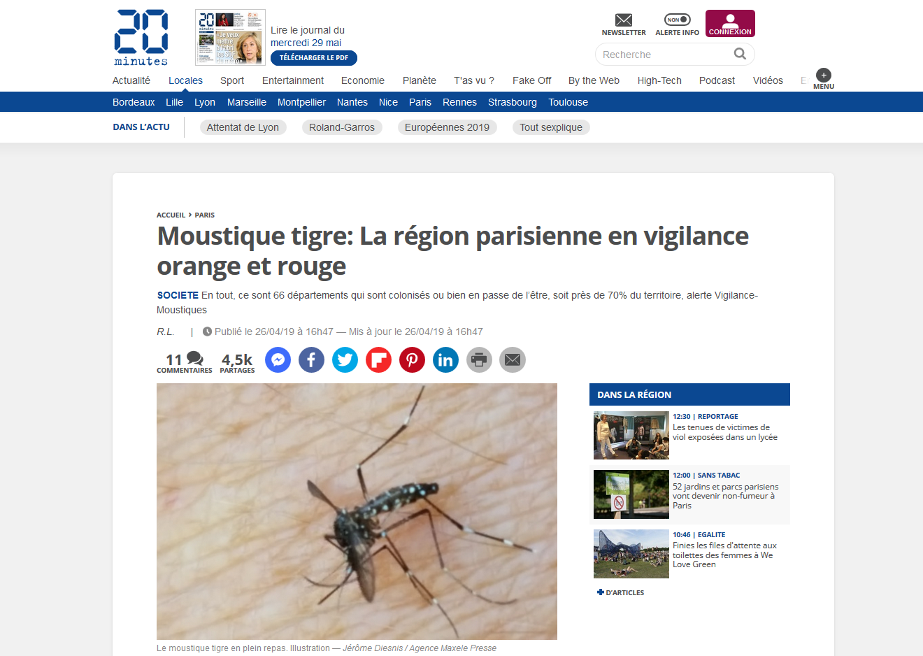 Pourquoi cette panique soudaine des rédactions françaises, qui semble avoir débuté le 26 avril dernier ? C'est que, relève Médiacités, le 26 avril est la date à laquelle un site dénommé "Vigilance moustiques" a envoyé un communiqué de presse à des dizaines de rédactions, les alertant de nouvelles zones de "vigilance rouge" et les invitant à consulter sa "carte 2019 du moustique tigre". La quasi-totalité des articles parus depuis la fin avril concernant le moustique tigre se basent de fait sur ce communiqué, reprenant soit la carte publiée par "Vigilance moustiques", soit une interview du président du site, Stéphane Robert.