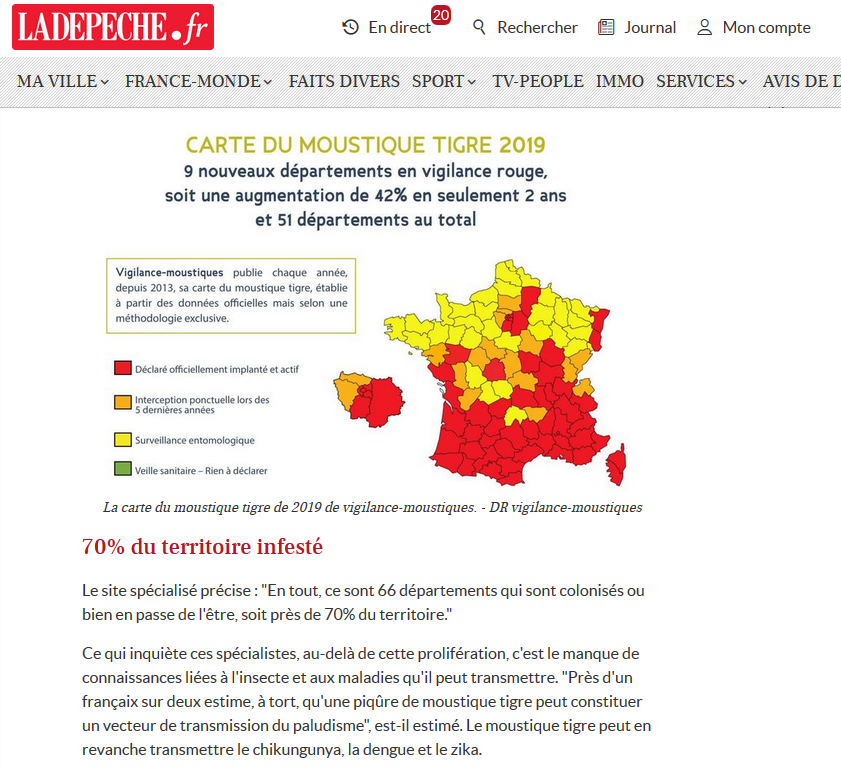 Mis bout à bout, les articles et sujets de journaux télévisés donnent envie de prendre une douche d'insecticide. Les moustiques tigre, qui peuvent transmettre "la dengue, le chikungunya, ou le zika" ont "colonisé définitivement" 51 départements français, "infest[ant] 70% du territoire", et ce n'est pas fini : "la colonisation de l’ensemble du territoire continue son accélération vers le nord"... Les Echos Week-end - dans leur édition du 17 mai - vont même jusqu'à lui inventer des pouvoirs imaginaires, comme celui de transmettre le paludisme (raté). A l'appui de leurs exhortations à la prudence, plusieurs rédactions brandissent des cartes de France balafrées de zones rouges façon alerte ouragan.