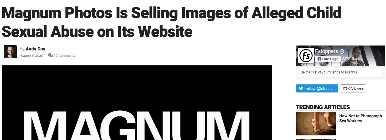 Ce n'est pas la première fois que Magnum doit faire face à ce type de scandale. En 2017, le magazine LensCulture avait illustré le lancement d'un concours en partenariat avec Magnum par l'image d'une jeune prostituée indienne de 16 ans, à visage découvert, effectuant une passe avec un client dans le quartier rouge de Calcutta. Un scandale qui avait, déjà, soulevé la question de l'image des jeune femmes de pays pauvres dans les médias occidentaux, comme l'expliquait alors NPR. En 2014, rappelle Andy Day le 18 août, Martin Parr, célébrissime photographe Magnum, préfaçait un livre du photographe catalan Txema Salvans sur la prostitution dans les rues espagnoles. Il saluait "l'astucieux procédé" du photographe employé pour "avoir accès à ses modèles": Salvans s'était déguisé en agent d'entretien de la voirie pour photographier les travailleuses du sexe qui avaient explicitement refusé d'être prises en photo. D'autre part, Magnum n'est pas la seule plateforme a être sous le feu des critiques : le 7 août, un (autre) article d'Andy Day pour FStoppers accusait Getty Images de vendre des photos d'enfants abusés sexuellement et parfaitement identifiables.