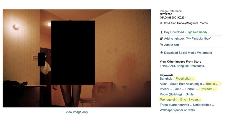 Au centre de l'accusation d'Andy Day, plusieurs clichés réalisés en 1989 par le photographe américain David Alan Harvey dans le cadre d'une série intitulée "THAILAND. Bangkok. 1989. Thai prostitutes." Parmi ces images, qui documentent le quotidien de travailleurs et travailleuses du sexe mineurs dans la capitale thaï, certaines montrent ces enfants à moitié nus, visage découvert. Sur l'une d'elles, une adolescente souriante s'avance, à visage découvert, vers le lit sur lequel le photographe est allongé. Contrairement à d'autres photos d'enfants dans des attitudes sexuellement explicites stockées dans l'archive Magnum, celles de Harvey ne sont accompagnées d'aucun avertissement quant à leur utilisation, qui doit nécessairement se faire "dans un contexte et avec une légende qui ne serait pas considérés comme légalement préjudiciable à toute personne reconnaissable". Et l'intention toute journalistique de sensibilisation à la prostitution infantile vient se heurter aux recommandations de l'Unicef, qui préconise de respecter six grands principes, parmi lesquels "prioriser la protection des intérêts de chaque enfant sur toute autre considération, ce qui inclut la promotion des droits de l'enfant."