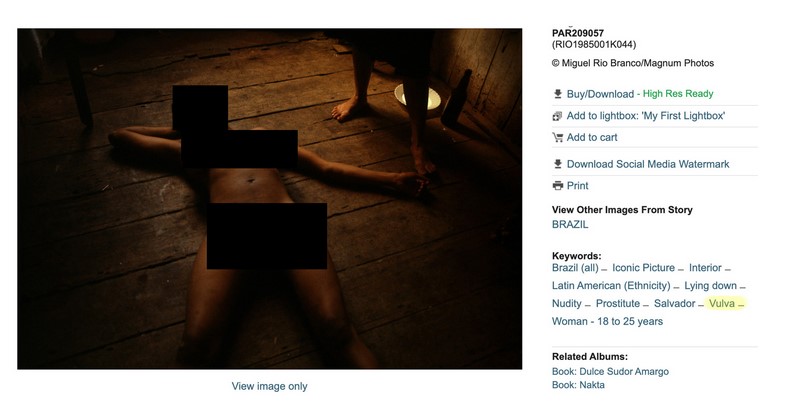 Dans son article, puis dans un second publié trois jours plus tard, Andy Day met le doigt sur un autre problème de la banque d'images Magnum : celui des mots-clés de recherche, ajoutés par des collaborateurs de l'agence, qui en disent long sur certains mécanisme de pensée. Les photos "problématiques" de Harvey ont été découvertes en cherchent "girl prostitute" dans le moteur de recherche interne, explique-t-il; sous plusieurs de ces photos, on trouve les mots-clé "Breast (sein)", "Prostitute (prostituée)" et "Teenage girl - 13 to 18 years old (adolescente - 13 à 18 ans)". Parfois, les choix de mots-clés sont encore plus troublants. Une photo du brésilien Miguel Rio Branco, dont la légende décrit "une prostituée allongée sur un sol en bois", est flanquée du mot-clé "vulve". Un cliché pris par Alex Soth, qui montre une pom-pom girl "entre 13 et 18 ans" en pleine extension et en tenue, contient le mot-clé "vagin". Le journaliste rappelle que le processus d'étiquetage des mots-clés, fastidieux s'il en est, est souvent sous-traité par les grandes agences de photo. Magnum n'en reste pas moins responsable du contenu publié sur son site.