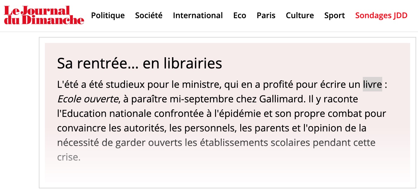 D'autant que, comme le précise Jean-Rémi Girard, le terme d'"école ouverte" n'est pas anodin. "L’emploi même de cette expression pose question : l’école ouverte, c’est le nom donné à des dispositifs mis en place pendant les vacances, les mercredis, les samedis, souvent pour les enfants qui n’ont pas la possibilité de faire du sport ou des activités en dehors de l’école. Il y a [chez Blanquer] une volonté de récupérer un contenu symbolique pour l’appliquer à autre chose, en l'occurrence la pandémie." Le dispositif "école ouverte" est en effet présenté sur le site du ministère de l'Éducation nationale comme permettant "aux jeunes, dès l'école élémentaire, qui vivent dans des zones urbaines et rurales défavorisées (...) de bénéficier de renforcement scolaire, d'activités éducatives et de loisirs." Il devait accueillir jusqu'à 400.000 élèves en 2020. Un glissement sémantique sur lequel, là encore, Jean-Michel Blanquer n'est jamais questionné. Pas plus tard que le 26 août, le ministre a répété vouloir maintenir les établissements scolaires ouverts, lors d'une conférence de presse donnée au ministère. En attendant la sortie du livre de Jean-Michel Blanquer, le porte-parole du gouvernement Gabriel Attal a annoncé le report au 13 septembre de la rentrée scolaire en Guadeloupe, à la Martinique, à Saint-Barthélemy ainsi que "dans les zones rouges de Guyane". Écoles fermées, donc.