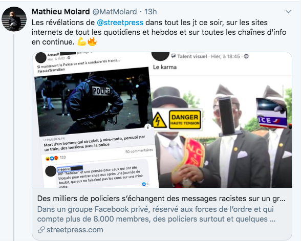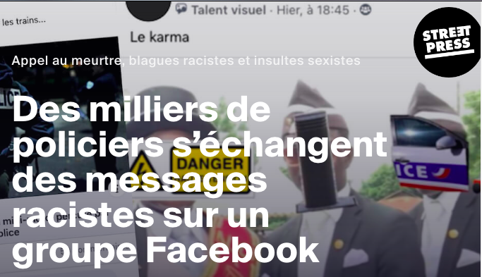 plus de temps, et j'ai vu des messages, des blagues, et des propos racistes. Tout s'est accéléré jeudi 28 mai, quand j'ai vu passer un 'meme' qui m'a choqué [le montage figure au tout début de l'article de StreetPress et fait l'apologie de plusieurs morts violentes causées par des policier, ndlr]. Le lendemain, j'ai écrit un pitch pour proposer mon sujet à plusieurs rédactions