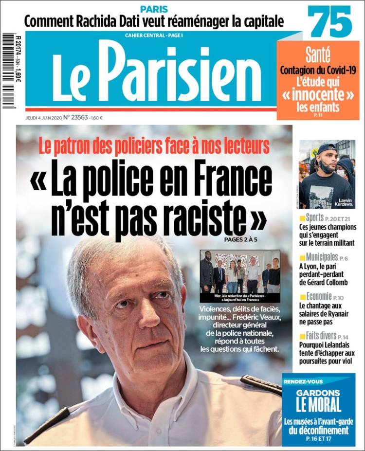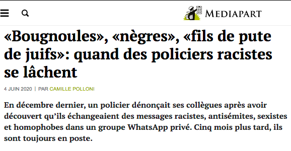 une enquête sur un groupe Facebook (national) de milliers de policiers, qui s'envoient des messages du même acabit. Alors que les affaires George Floyd et Adama Traoré secouent l'opinion publique, de nombreux médias se demandent si la situation française est comparable à celle des États-Unis. La police française est-elle vraiment aussi raciste que la police américaine ? Face à ces interrogations, certains se fendent d'une chronique un peu gênée. D'autres, comme Le Parisien ce 4 juin, laissent la parole au directeur général de la police nationale qui l'assure : "La police en France n'est pas raciste."