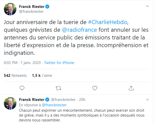 jusqu'ici, comme le rappelle Télérama, sur la grève menée depuis le 25 novembre par les salariés de la maison ronde pour protester contre le plan de la direction qui prévoit la suppression de 300 postes (avec 76 créations de postes en parallèle), le ministre a fini par s'exprimer sur le sujet. "Jour anniversaire de la tuerie de Charlie Hebdo, quelques grévistes de Radio France font annuler sur les antennes du service public des émissions traitant de la liberté d'expression et de la presse. Incompréhension et indignation",