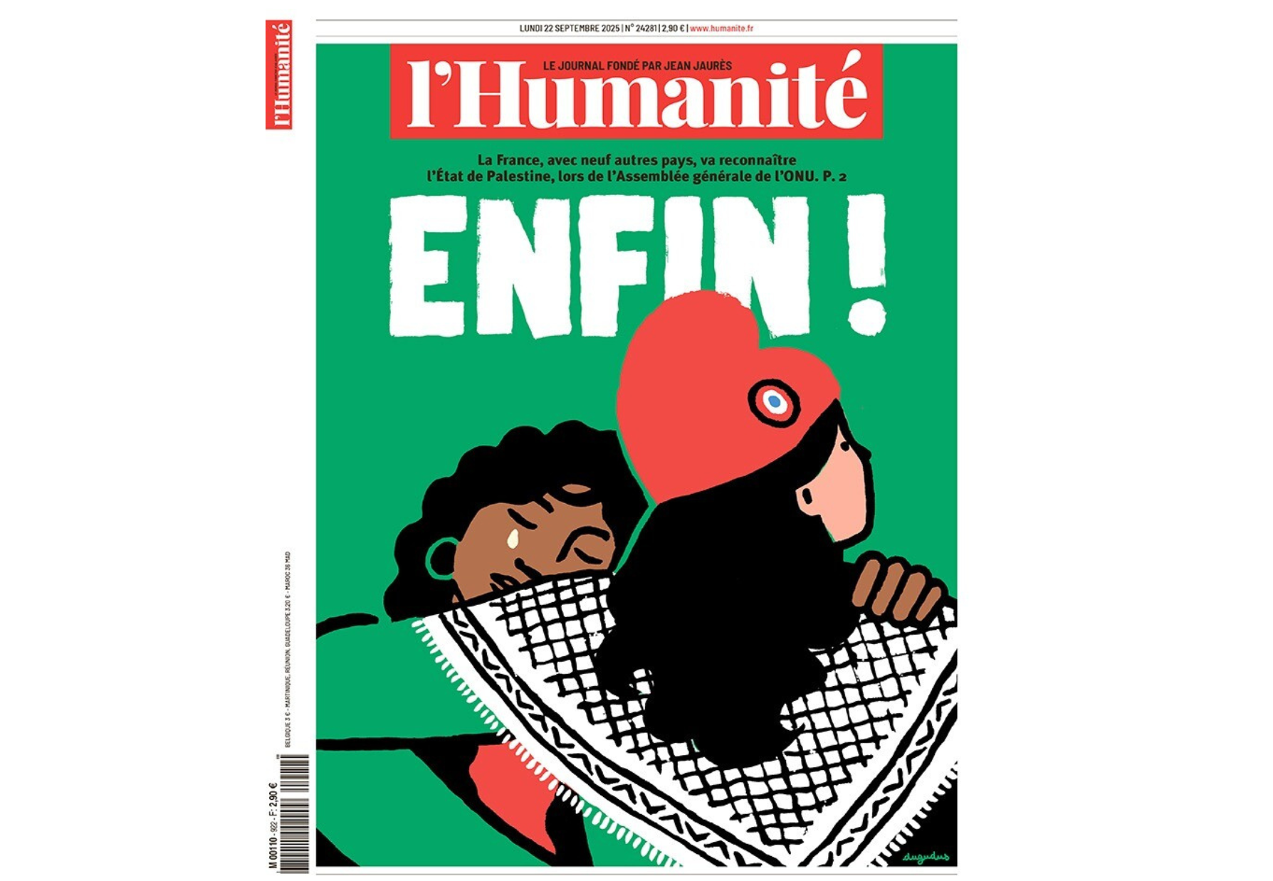 L'Humanité a consacré sa une du lundi 22 septembre à la reconnaissance par la France (et plusieurs autres pays) de l'État de Palestine, lors de l'Assemblée générale de l'ONU. Sur un fond vert, le mot "Enfin" est ponctué d'un point d'exclamation. En-dessous, deux personnages représentés : une Marianne, de dos, keffieh sur les épaules, visage de profil, menton légèrement en avant, et bonnet phrygien sur la tête, cocarde bleu-blanc-rouge en évidence. Dans ses bras, la tête posée sur son épaule, une autre femme, racisée, aux cheveux noirs ondulés, yeux fermés et larme sur la joue. La Palestine.
