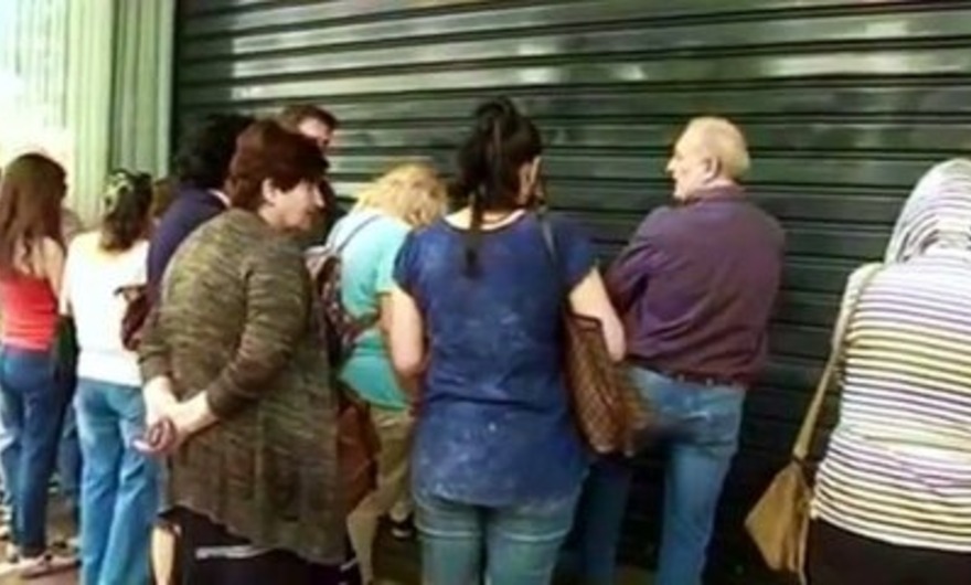 Ces Grecs ne sont pas devant un distributeur, mais devant un rideau de fer baissé