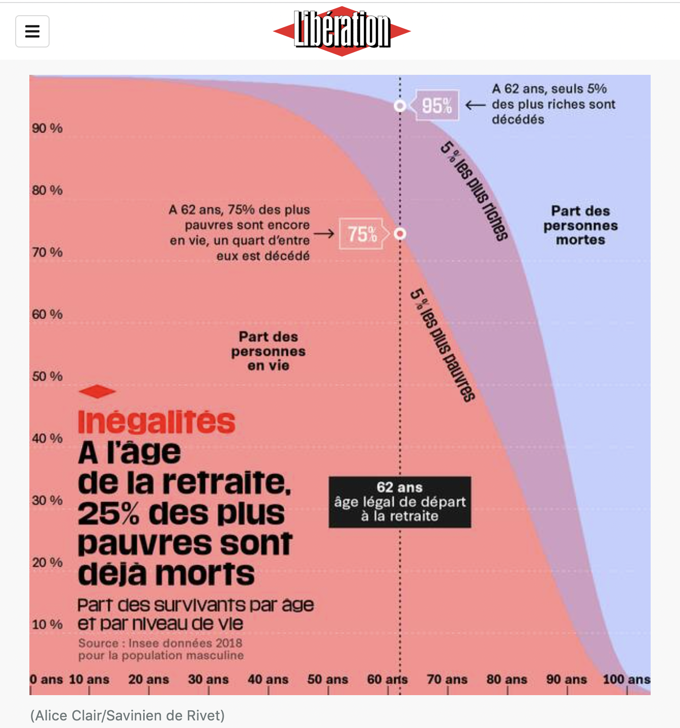 À cette époque, Libération publiait un graphique impressionnant : "À 62 ans, un quart des 5 % des hommes les plus pauvres en France sont déjà morts. Il faut attendre l'âge de 80 ans pour que cette proportion soit atteinte pour les 5 % les plus riches". Comme le relève Cohen dans sa chronique, cette affirmation est depuis largement relayée par les opposants à la réforme des retraites, que ce soit Boris Vallaud, président du groupe PS à l'Assemblée nationale, Mathilde Panot, présidente du groupe LFI ou encore les secrétaires généraux des syndicats CFDT et CGT que sont Laurent Berger et Philippe Martinez. Pour en conclure que le projet de réforme des retraites promettait "la misère ou le cimetière" pour citer Panot – slogan adapté de "la retraite pour les morts" remontant à la CGT en 1910.