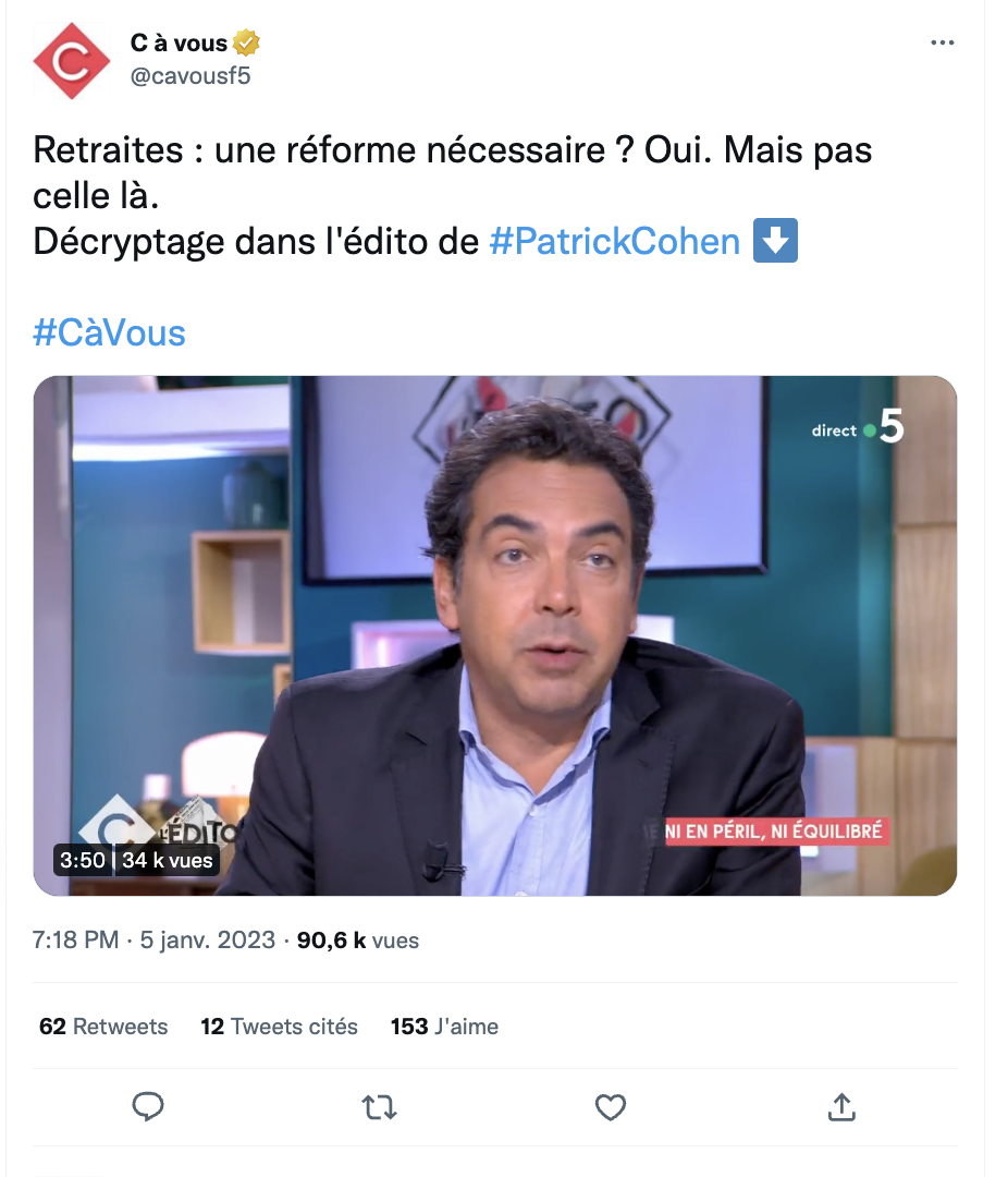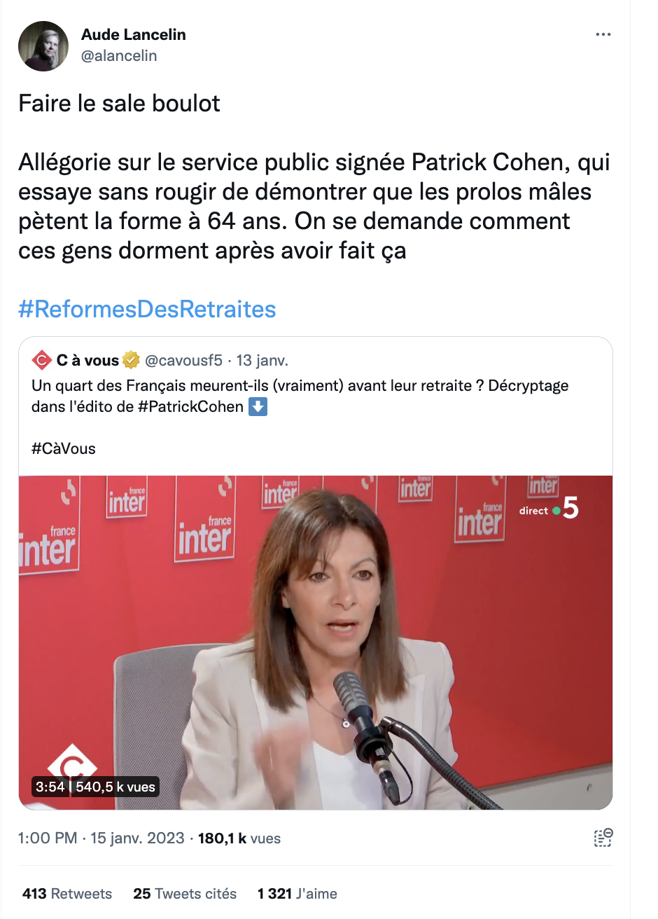 "Un quart des Français meurent-ils (vraiment) avant leur retraite ?" Le 13 janvier dernier, Patrick Cohen pose cette question au haut potentiel polémique, dans sa chronique de l'émission C à vous sur France 5. "Cette statistique est-elle vraie ?", demande à Cohen la présentatrice de C à vous Anne-Élisabeth Lemoine : "Alors disons qu'elle est hors sujet, et nettement moins spectaculaire que son résumé", répond l'ancien animateur de la matinale de France inter. Il explique alors que cette affirmation – prononcée par Anne Hidalgo au micro de France Inter pendant la campagne présidentielle – est saugrenue, déformant une information très relayée depuis décembre 2021.