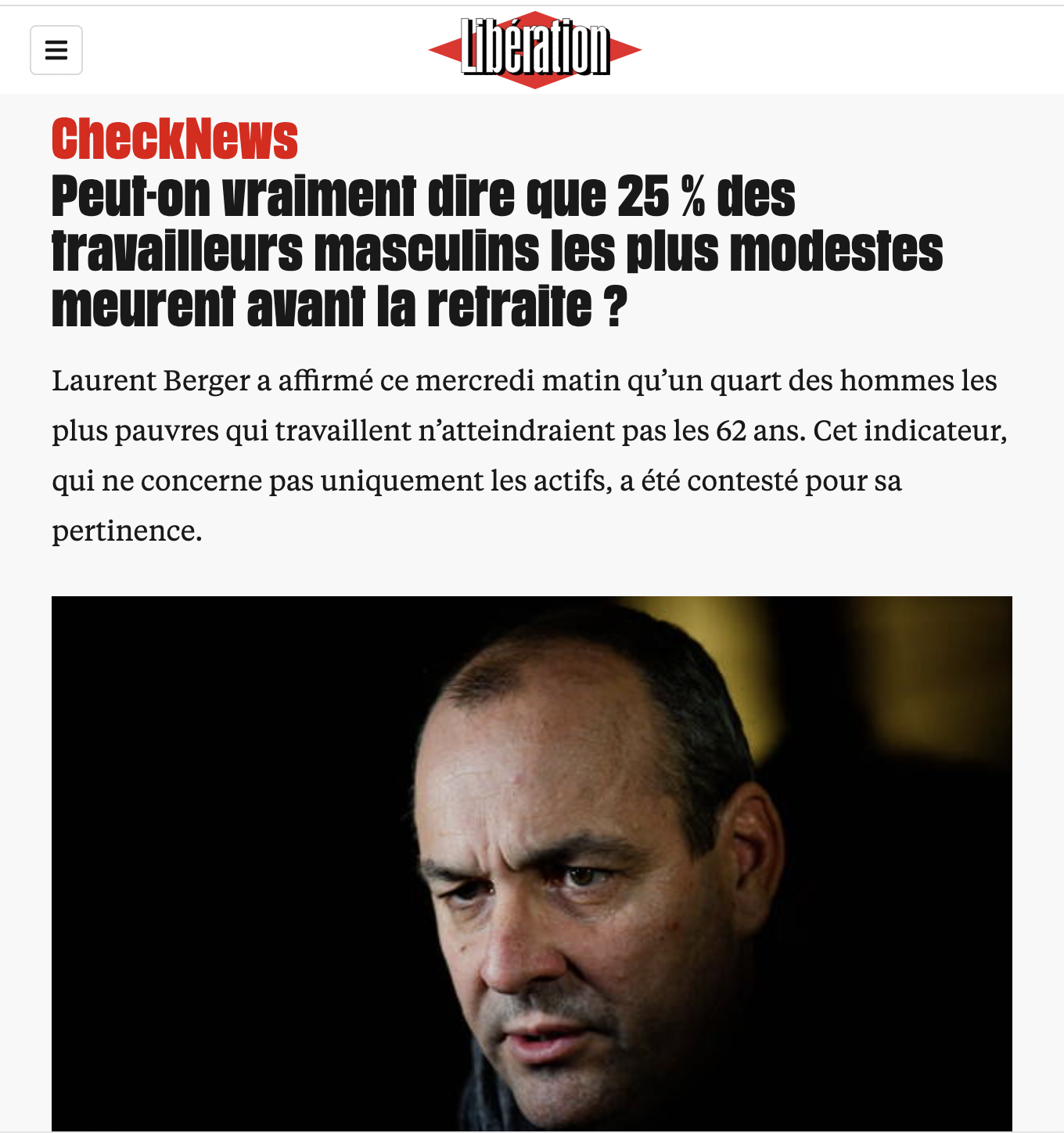 Le service de vérification des faits du quotidien, CheckNews, s'en est d'ailleurs chargé le matin même de la chronique de Cohen sur France 5, à partir de propos de Laurent Berger sur France Inter le 11 janvier : "Il y a 25 % des hommes qui sont les travailleurs les plus modestes [et] qui sont morts au moment d'arriver à la retraite." CheckNews relève que le patron de la CFDT "déforme légèrement" l'indicateur mis en exergue par Libé. Même si elle concède que "la pertinence de cette statistique choc a depuis été remise en question par des économistes", dont Zemmour et Lojkine. "Nous voulions montrer l'inégalité devant la mort en fonction du niveau de vie : c'est un repère", explique à CheckNews le journaliste de données chez Libération Julien Guillot.