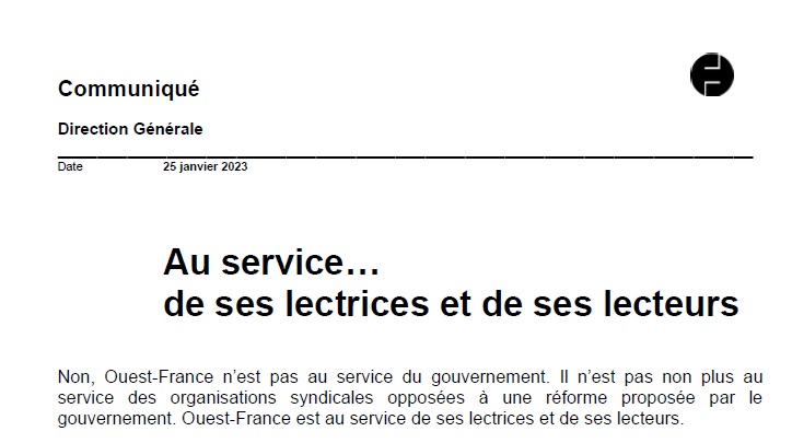 Une semaine après le tract rageur du SNJ, les journalistes d'Ouest-France ont reçu un courriel signé "direction générale". Elle y assure ne pas être "au service du gouvernement"... et "pas non plus au service des organisations syndicales opposées à une réforme proposée par le gouvernement". La direction déplore ensuite que le SNJ "attaque le travail des journalistes" de la rédaction à "la veille des manifestations", ce qui "n'est pas acceptable" – elle sous-entend en effet que le SNJ met en danger le travail des journalistes couvrant les manifestations en dénonçant "le travail de ces mêmes journalistes". Concernant l'éditorial de Jeanne-Emmanuelle Hutin, la direction générale met en avant le fait que la petite-fille du fondateur affirmait vouloir "sauvegarder" le système par répartition en le réformant (ce qui est le principal élément de langage gouvernemental), ainsi que le souhait d'un "dialogue respectueux" (dont on a vu qu'il consistait surtout à ne pas faire grève et à ne rien bloquer).