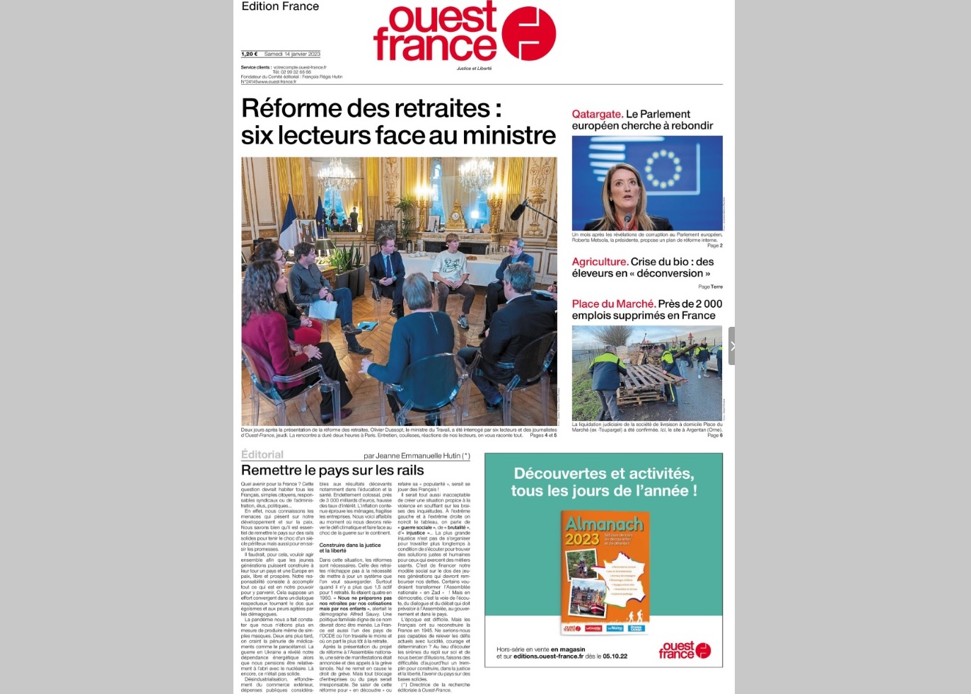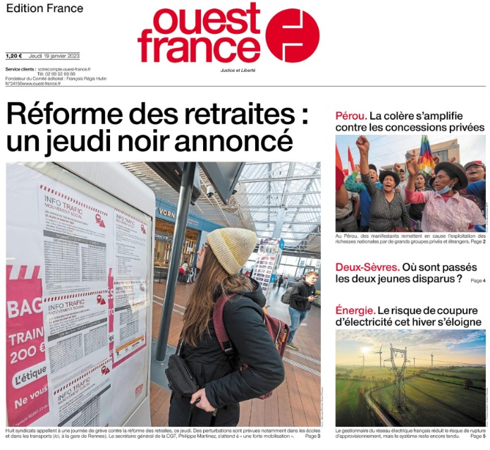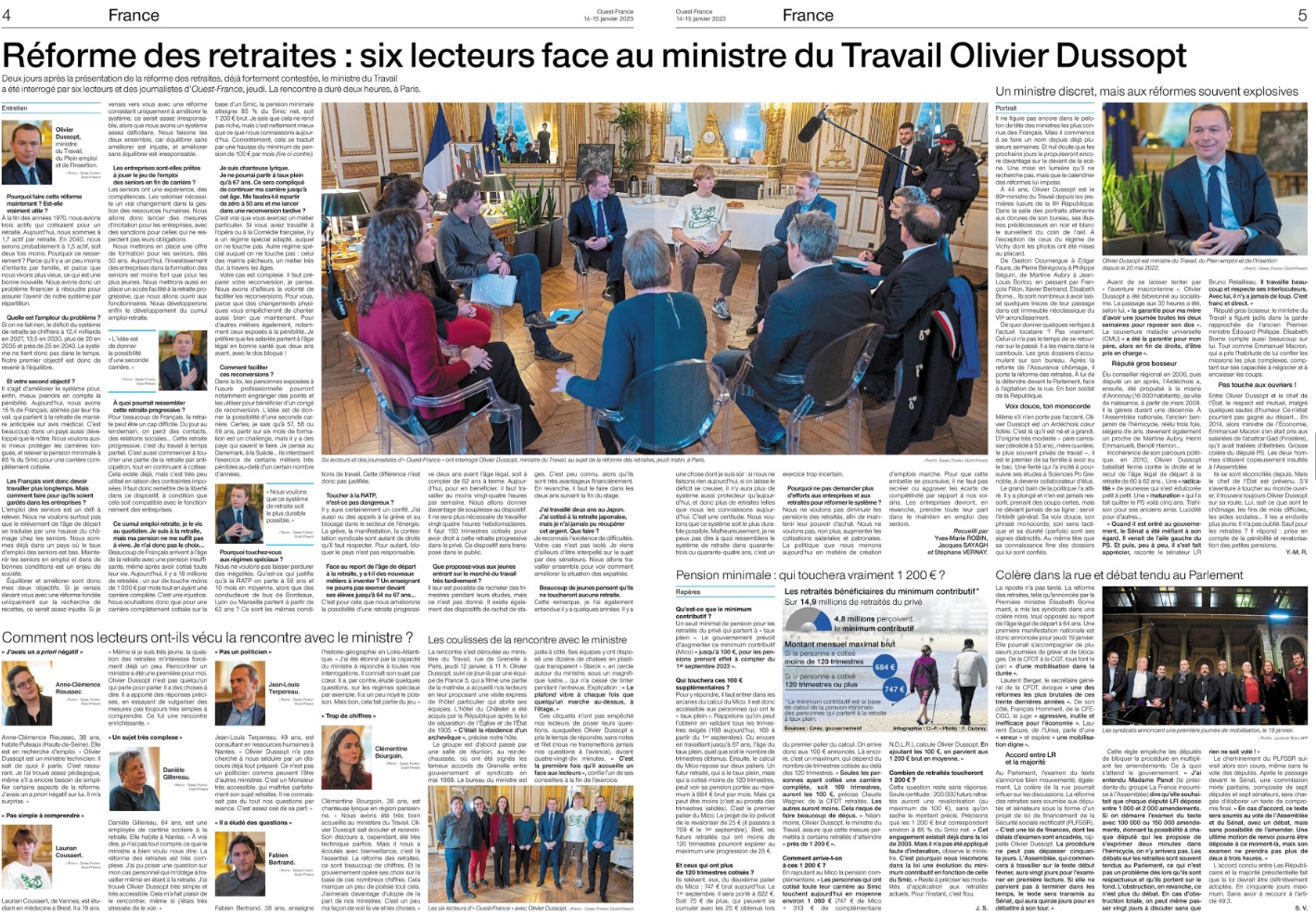Quelques jours avant la mobilisation contre le projet de réforme des retraites, les éditions d'Ouest-France du samedi 14 janvier annoncent en Une : "Six lecteurs face au ministre" – en l'occurrence celui du Travail, Olivier Dussopt. Les pages 4 et 5 du journal sont consacrées à cet entretien, notamment sous les plumes du rédacteur en chef adjoint du service France et du directeur de la rédaction parisienne du quotidien.