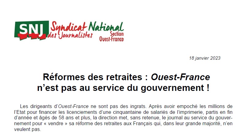 Cette couverture a d'ailleurs provoqué une réaction du principal syndicat de la rédaction du quotidien. "La direction met, sans retenue, le journal au service du gouvernement pour «vendre» sa réforme des retraites aux Français qui, dans leur grande majorité, n'en veulent pas", écrit le SNJ d'Ouest-France dans un tract du 18 janvier. Il y dénonce la double page ministérielle, "véritable opération de communication au service du ministre du Travail" dans laquelle "dix lignes sont accordées aux opposants qui ne manquent pourtant pas d'arguments pour démonter ce projet de loi injuste et injustifié". Sans oublier l'éditorial de "la directrice de la recherche éditoriale" Jeanne-Emmanuelle Hutin : elle "chercherait à faire fuir ceux qui nous lisent encore qu'elle ne s'y prendrait pas autrement" alors que "la baisse de la diffusion, particulièrement inquiétante, n'a pourtant pas besoin de ce genre de provocation". Et le SNJ de rappeler que "depuis des semaines, cette couverture qui reprend les «éléments de langage» du discours officiel, fait pencher Ouest-France du côté des partisans du recul de l'âge légal et de l'augmentation du nombre de trimestres à cotiser".