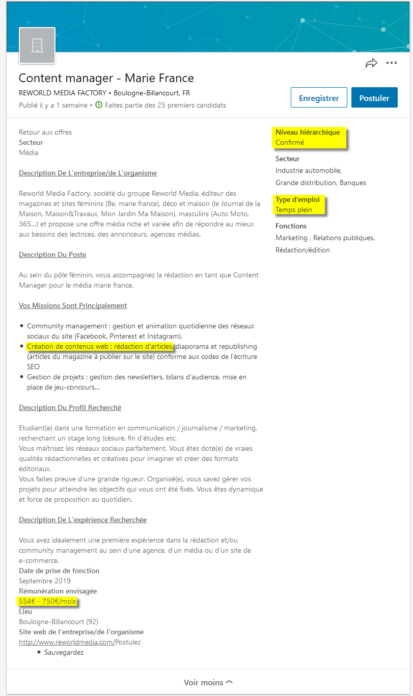 Pour ce stage de "content manager" à "temps plein" basé dans les locaux de Reworld à Boulogne-Billancourt, au "niveau hiérarchique confirmé" et pour lequel le candidat aura "idéalement une première expérience", le stagiaire se voit proposer une rémunération de "554€ - 750€/mois". Le prix d'une première expérience épanouissante et formatrice ? Pas franchement, si l'on en croit les anciens chargés de contenus interrogés par ASI, qui se souviennent de stagiaires qui "vivaient assez mal la pression et la charge de travail", "ne savaient pas trop qui était leur chef vu le turn-over permanent" et devaient malgré tout eux aussi "remplir les quotas" de cinq contenus par jour. Une