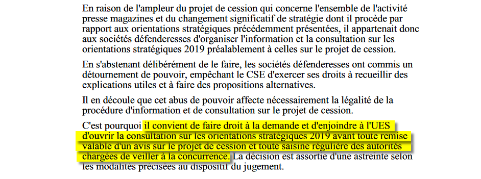 Depuis, l'acquisition a été finalisée et rien, dans la manière dont cette reprise s'est faite, n'est de nature à les rassurer les équipes de Mondadori. Alors que le tribunal de grande instance de Nanterre, dans un jugement rendu le 11 juillet et dont ASI a obtenu copie, condamnait Mondadori à ouvrir une consultation sur ses orientations stratégiques 2019 avant de procéder à la suite de la cession, celle-ci a été annoncée en grande pompe le 31 juillet par Reworld. Un "passage en force au mépris de la loi", dénonce l'intersyndicale.