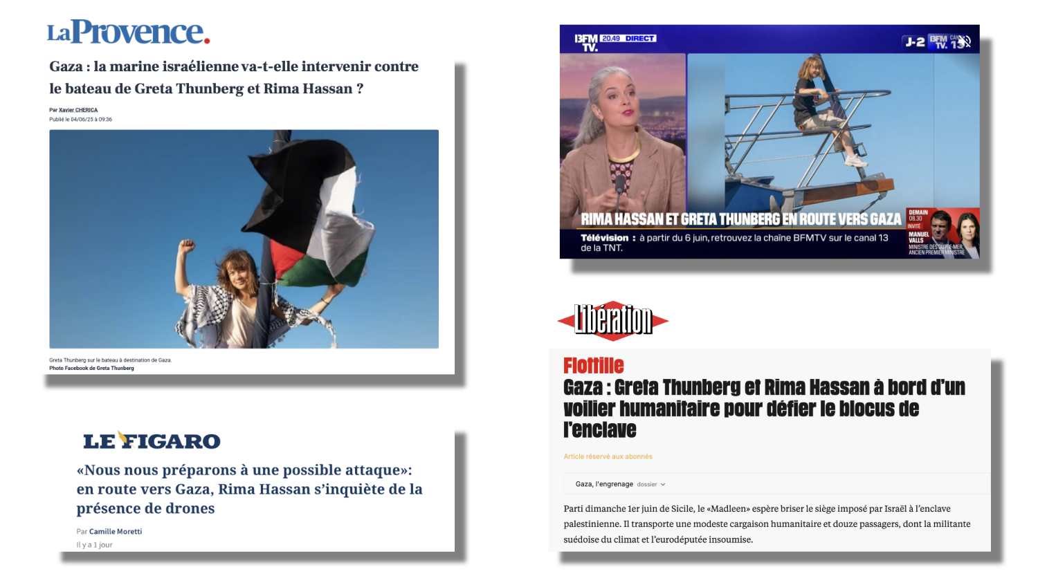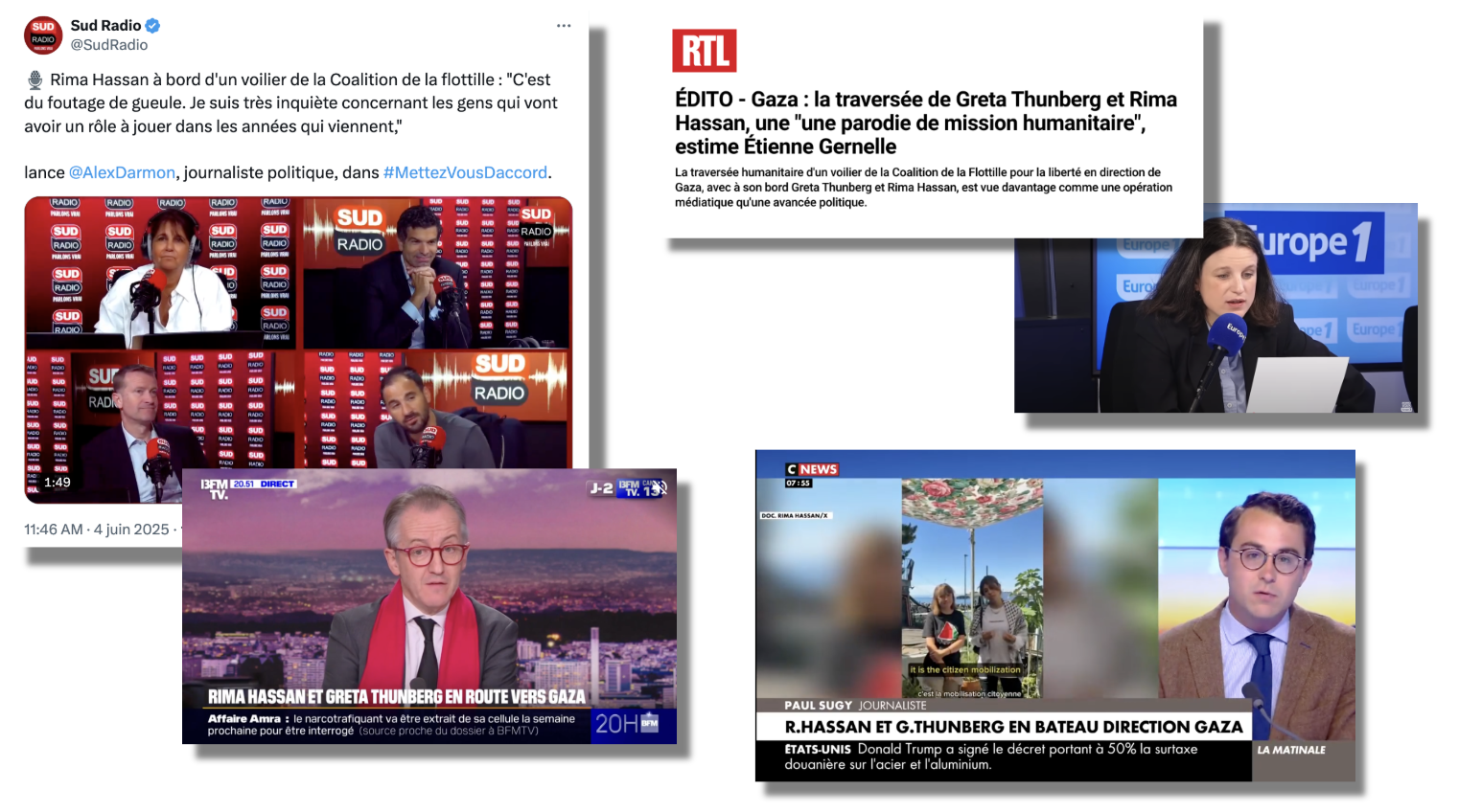 Pour décrire l'initiative, Sud Radio parle des "vacances de Rima Hassan". L'eurodéputée et "son amie" Greta Thunberg "s'éclatent bien" en buvant du "jus d'ananas". La plupart rappellent que la flottille a pour but d'ouvrir un corridor humanitaire à Gaza, d'amener des vivres et de réclamer la levée du blocus. Elle n'en resterait pas moins un "foutage de gueule", selon le journaliste politique Alex Darmon. Une "parodie de mission humanitaire", pour le journaliste du Point Etienne Gernelle, sur RTL. Un bandeau sur LCI (relevé par Quotidien) s'indigne : "NON AU COUP DE COM SUR LE DOS DES GAZAOUIS !". C'est le sujet de la chronique 60 secondes pour convaincre du grand reporter Thomas Misrachi.