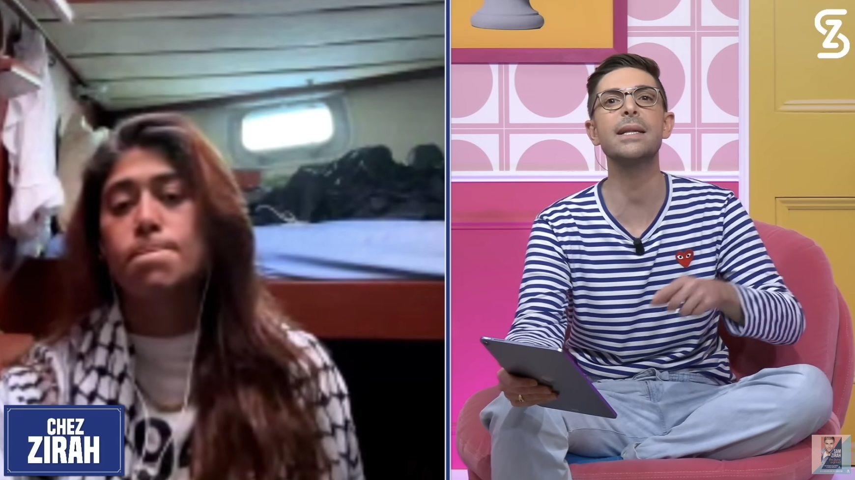 Rima Hassan a, par exemple, affirmé être prête à mourir au cours de cette opération. Mise en scène ou réel sacrifice ? Sam Zirah l'a interrogée sur cette assertion. Il lui a également exposé une question que Bernard Henri-Levy aurait aimé poser à Greta Thunberg, au sujet de la flottille : "pourquoi dans sa jeune vie d'activiste, n'a-t-elle jamais milité pour les 400 000 morts du Yémen, les 13 millions de Soudanais déplacés, les Ouïghours génocidés, les Rohingyas déportés, pourquoi ?" Rima Hassan répond notamment que "la cause du peuple palestinien" est surtout une "cause décoloniale". Sam Zirah l'a enfin confrontée aux scènes de "baignades" de l'équipage, dans la mer, au soleil, qui ont indigné certains éditorialistes (comme Étienne Gernelle) ainsi qu'au peu de vivres transportées par le bateau : une aide humanitaire dérisoire au regard des besoins.