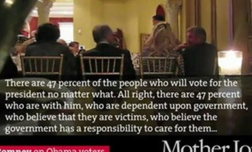 Lors d'un dîner privé (donné à une date non précisée), auquel participaient de riches donateurs qui soutiennent sa campagne, Mitt Romney a déclaré que les 47% d'Américains qui déclarent vouloir voter pour Obama ne paient pas d'impôts, dépendent du gouvernement et "se prennent pour des victimes". La vidéo a été enregistrée à son insu, et mise en ligne lundi dernier sur le site du magazine Mother Jones. Elle a stupéfait les observateurs et la classe politique, qui y voient une énorme gaffe du candidat républicain, déjà, en difficulté dans les sondages. Un chroniqueur de l'agence de presse économique Bloomberg a même titré un billet : "Aujourd'hui, Mitt Romney a perdu l'élection" |