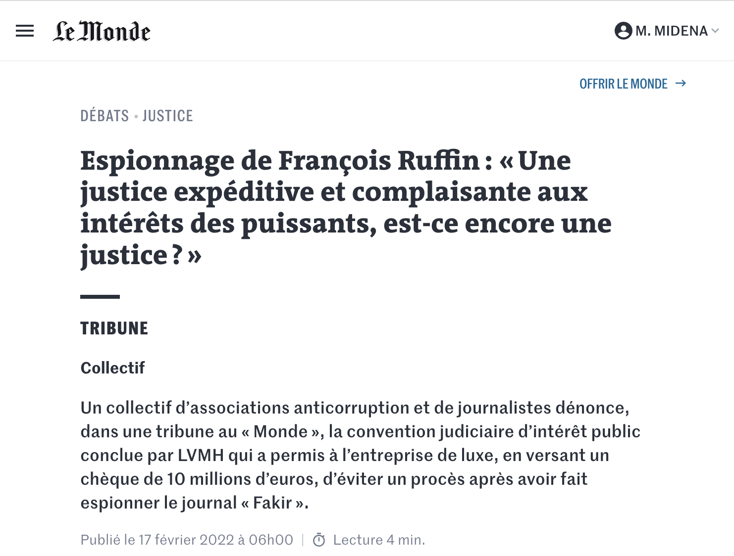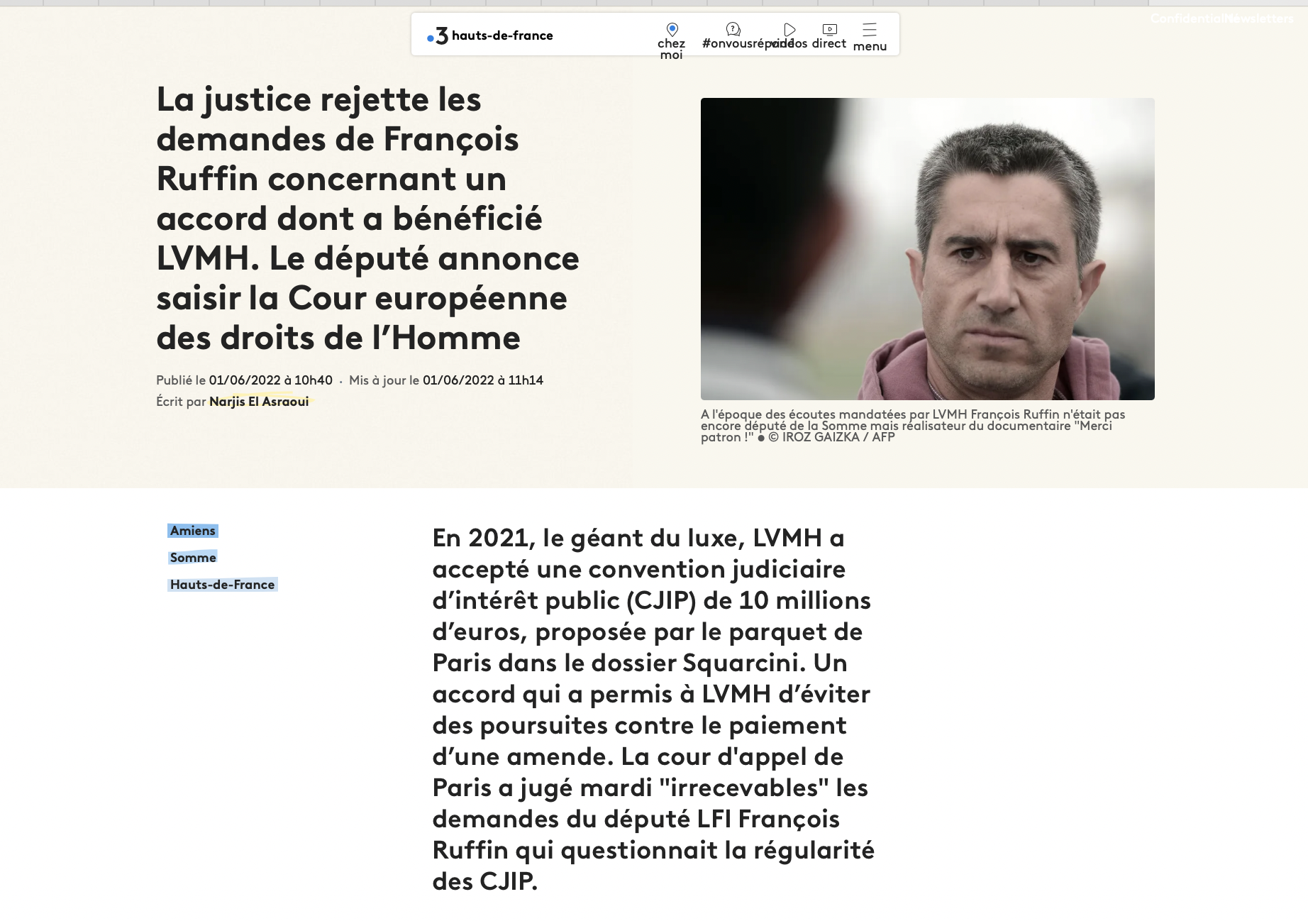 Cette affaire, "c'est comme si un Français moyen faisait espionner son voisin, et qu'il s'en tirait avec une amende de dix euros". Robin Cabanel, coordinateur du journal Fakir et ancien collaborateur parlementaire du député François Ruffin, est amer auprès d'ASI. Mardi 31 mai, la cour d'appel de Paris a débouté l'association Fakir (qui édite le journal) ainsi que François Ruffin, qui avaient fait appel d'une décision de justice dans le cadre d'un dossier spectaculaire mêlant la multinationale LVMH, son directeur général Bernard Arnault, et l'ancien directeur des renseignements intérieurs, Bernard Squarcini. Dans le cadre d'une convention judiciaire d'intérêt public (CJIP), jeune procédure judiciaire, LVMH a payé dix millions d'euros au Trésor public... pour s'éviter un procès pénal. Rappel : LVMH a fait espionner François Ruffin, via Bernard Squarcini, quand Ruffin, alors journaliste, tournait Merci patron ! un documentaire sur des ouvriers mis au chômage suite à la délocalisation d'une usine LVMH en Pologne. Le film décrochera en 2017 le César du meilleur documentaire. Notre émission de 2016 est ici, en accès libre.