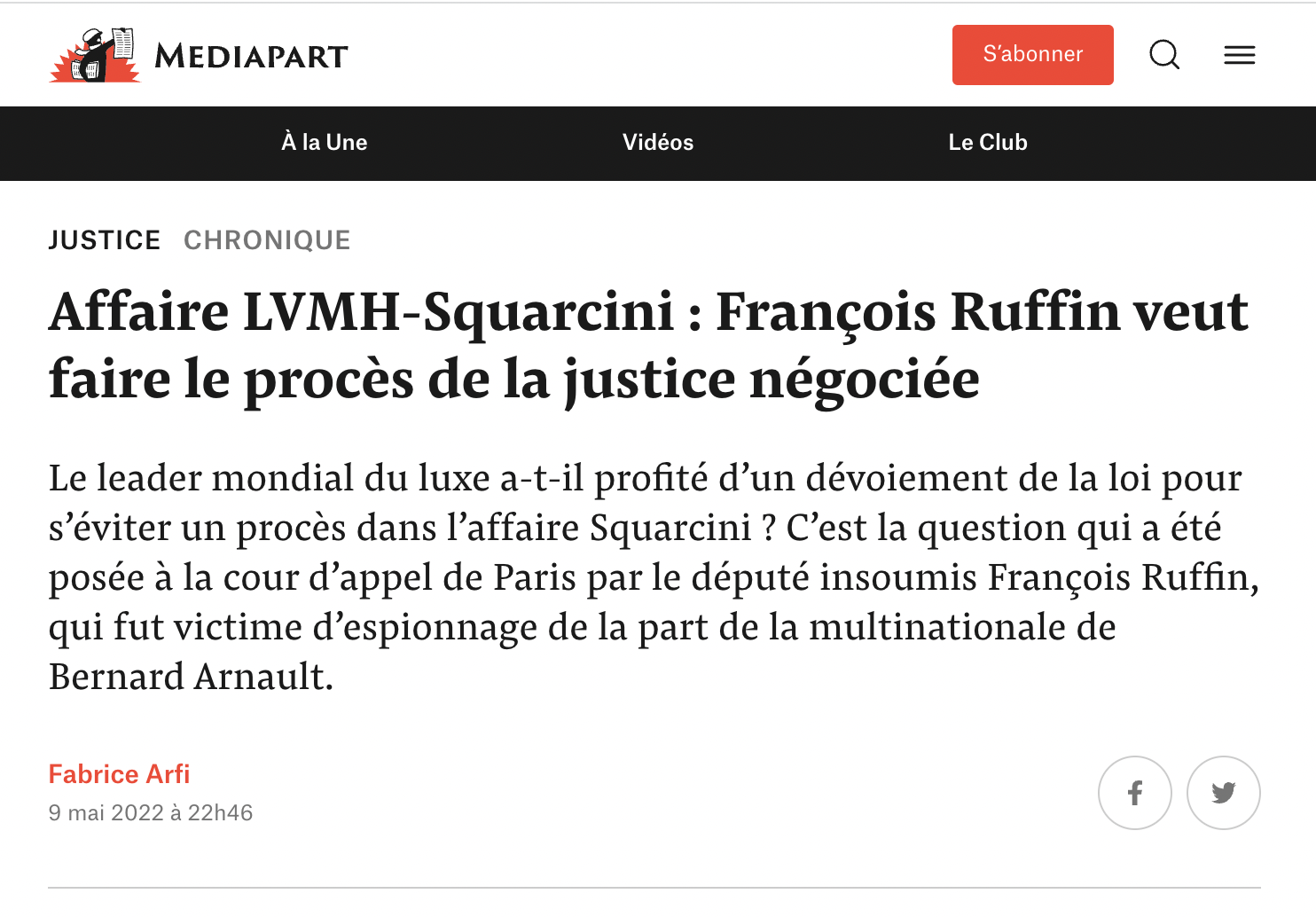 Le 17 décembre 2021 donc, dans le cadre d'une CJIP, cette nouvelle procédure, le tribunal de Paris a validé l'accord signé entre LVMH et le parquet dans l'affaire Squarcini, comme le révélait Mediapart. Le leader mondial du luxe a reconnu les faits... et accepté de payer une amende de dix millions d’euros contre l’absence de poursuites pénales. François Ruffin, lors de l'audience officialisant cette décision, a qualifié cette convention de "cadeau de Noël" fait à Bernard Arnault. La somme, en effet, paraît dérisoire : dix millions d'euros, c'est 0,02 % du chiffre d'affaires de LVMH. Alors que la loi prévoit des sommes pouvant aller jusqu'à 30 % du chiffre d'affaires dans le cadre de ces conventions. Dans une tribune au Monde, un collectif d'associations anticorruption et de journalistes ont dénoncé cette convention et cette justice "à deux vitesses" que peuvent s'acheter les plus riches : "Une justice expéditive et complaisante aux intérêts des puissants, est-ce encore une justice ? Où s’arrêtera cet élargissement, ce détournement de la CJIP ? Quels délits, commis par des multinationales, pollutions, mises en danger de la vie d’autrui, atteintes à la liberté d’expression, etc., quels délits ne pourront pas faire l’objet de cet avatar du commerce des indulgences ? Quels délits ne seront pas rachetés par le chéquier ?"
