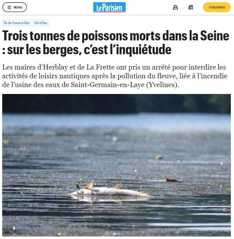 Tout va bien donc ? Auprès d’Arrêt sur images, le journaliste du Courrier des Yvelines/78 Actu Nicolas Giorgi raconte : "Très vite après l’incendie, on a reçu des messages d’habitants nous signalant que des poissons morts flottaient partout en bord de Seine et que l’odeur était insoutenable." Le déversement dans le fleuve d’eaux chargées de matière organique (matières fécales notamment), provoque un manque d’oxygène et l’asphyxie des poissons, reconnaissent les autorités. Ce 5 juillet, face aux journalistes locaux, le SIAAP parle simplement de "quelques dizaines de poissons morts". Et pourtant… Certains habitants, associations locales, pêcheurs et bateliers affirment de leur côté que les cadavres de poissons se comptent "par milliers".