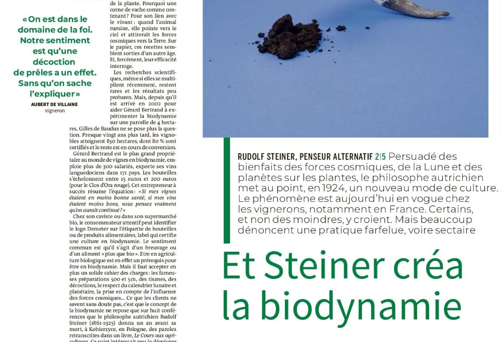 , et de journalistes auteurs d'enquêtes sur l'anthroposophie, s'agacent de la structure des articles, où les voix critiques, bien que nombreuses, sont étouffées par des propos favorables au mouvement. La mise en pages est également critiquée, qui semble valoriser le mouvement. Exemple avec l'article consacré à la biodynamie, une pratique agricole qui consiste notamment à utiliser de la bouse compostée dans des cornes de vache, et à tenir compte du calendrier lunaire. Jean-Benoît Meybeck, auteur de Cosmo Bacchus, une série de BD sur la mode biodynamique chez les vignerons, est cité dans cet article. "L'article est plutôt équilibré, mais j'ai été très mécontent de sa présentation dans le journal, avec des intertitres et une iconographie systématiquement en faveur de la biodynamie", signale-t-il à ASI.