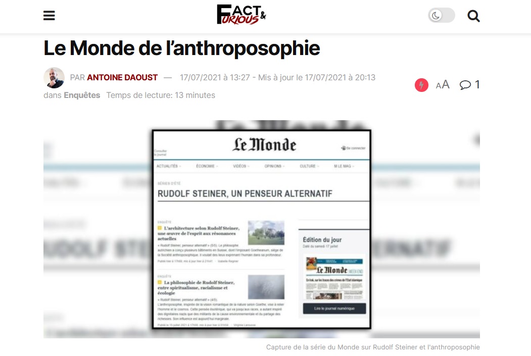 Le premier média à dégainer contre Le Monde est le site de fact-checking Fact and Furious (celui qui avait dénoncé les connexions russes de l'intox anti-Pfizer). L'article de Fact and Furious, titré "Le Monde de l'anthroposophie", dévoile l'existence d'un dossier de presse préparé à l'intention du Monde
