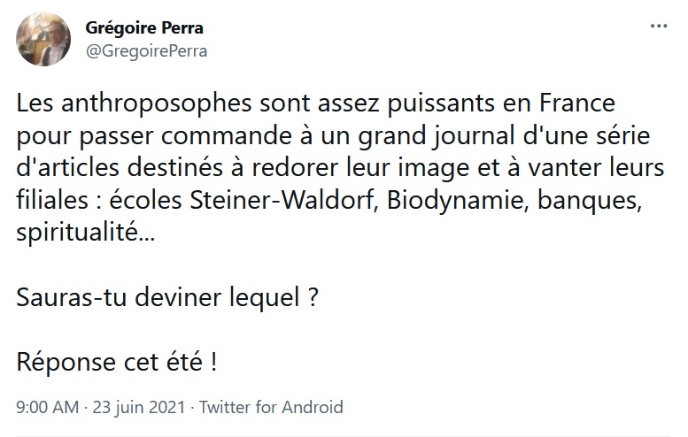 Première voix critique de l'anthroposophie en France : l'ex-enseignant en école Steiner Grégoire Perra. Coauteur du livre Une vie en anthroposophie et fondateur d'un blog dédié, où il expose les dangers des préceptes de Steiner, il a été le premier à dénoncer la série du Monde. Il l'a d'ailleurs fait avant même sa publication, ayant refusé, après avoir longuement rencontré les journalistes, d'y être cité. "Je me suis aperçu que tout ce qu'ils connaissaient du sujet, ils le tenaient des anthroposophes, car je connais bien leur discours de défense, très rodé. Ils en étaient imprégnés, et convaincus, assure-t-il. D'autre part, ils étaient extrêmement hostiles et agressifs." Les journalistes du Monde, eux, contestent avec vigueur cette analyse. Ils assurent qu'avant d'exiger l'absence de citation par un recommandé de son avocat, Perra s'était montré poli et cordial dans un courriel après l'entretien. L'intéressé le reconnaît auprès d'ASI