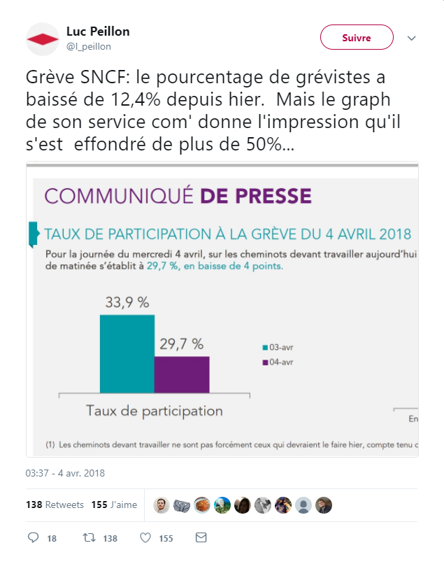 , dénonce sur Twitter le manque de rigueur dans les proportions d'un graphique de la direction de l'entreprise, dont les cheminots sont en grève depuis mardi 3 avril. Il reprend l'infographie du communiqué de presse de la SNCF sur la différence de taux de participation à la grève entre mardi et mercredi.