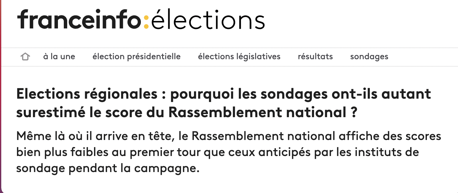 Vincent Tiberj : - Le plantage des sondeurs a été magistral sur le vote Rassemblement national. Quand on compare le tout dernier sondage Ifop sur les intentions de vote RN aux résultats, il y a six points d'écart ! On était persuadés que le RN allait remporter plusieurs régions, quand même... Clairement, le mode de questionnement par le web est en cause.