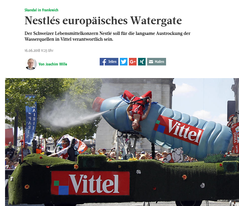 Pour une couverture plus extensive, c'est de l'autre côté de la frontière qu'il faut aller voir. En Allemagne, où les fameuses bouteilles "Bonne Source" sont distribuées, les mot-clés "Nestlé", "Vittel" et "Skandal" font surgir un plus grand nombre de publications. A commencer par un reportage diffusé dans l'Envoyé Spécial