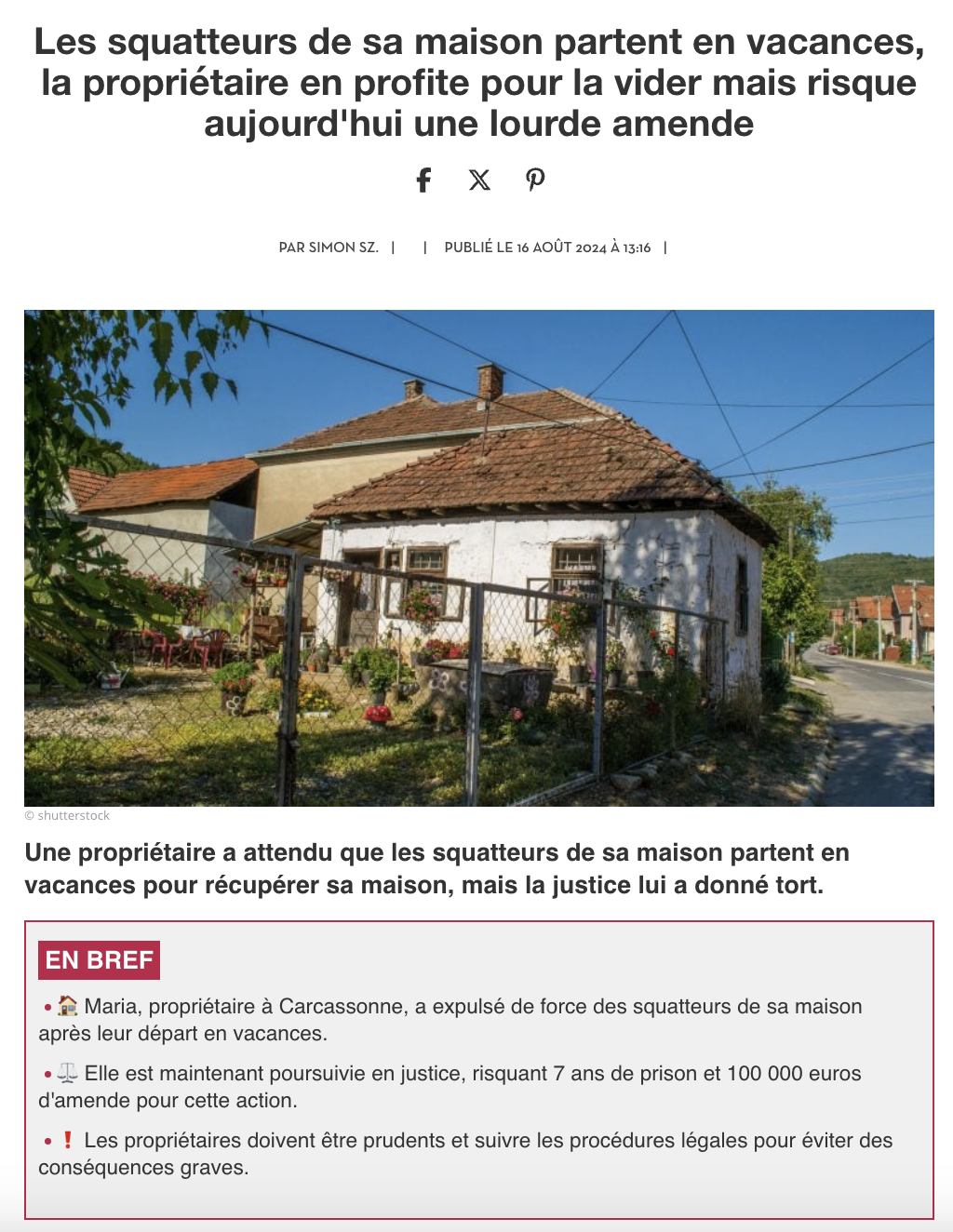 L'affaire date d'il y a deux ans. A priori, aucune raison d'en reparler aujourd'hui. Et pourtant, le "squat de Carcassonne" s'est de nouveau retrouvé sur le devant de la scène par l'action combinée de Marie France, de la Dépêche, et des Grandes Gueules de RMC qui ont donné un nouveau souffle à cette affaire datant de 2022. Le 16 août en début d'après-midi, le site Marie France publie un article intitulé "Les squatteurs de sa maison partent en vacances, la propriétaire en profite pour la vider mais risque aujourd'hui une lourde amende". L'auteur de l'article n'a pas répondu à nos sollicitations.