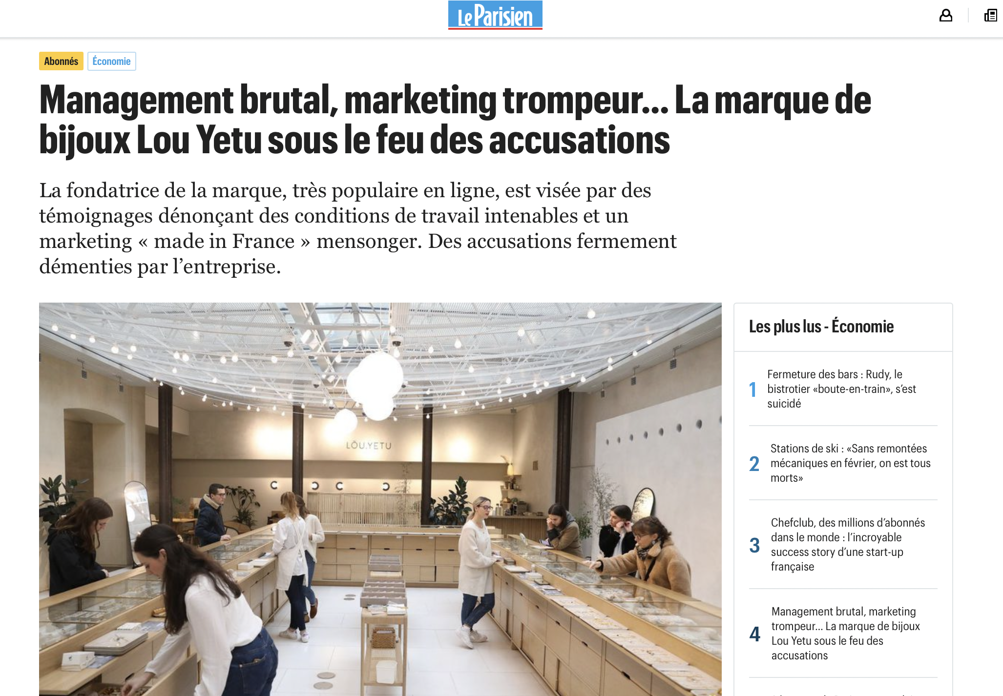 La liste est longue des déboires subis. Outre les pressions de la fondatrice Camille Riou, les horaires à rallonge, les méthodes de recrutement, et l'absence de "distinction entre vie pro et vie privée", un potentiel mensonge de fabrication est pointé du doigt . De nombreux témoignages affirment que les bijoux ont été sourcés chez des grossistes chinois -Lou Yetu a tout démenti auprès du Parisien. Mercredi 27 janvier, c'est Libération qui s'est emparé du sujet. Phénomène "d'emprise", "humiliations", "burn-out", "début d'alcoolisme", crises d'anxiété à répétions. L'enfer made in startup nation.