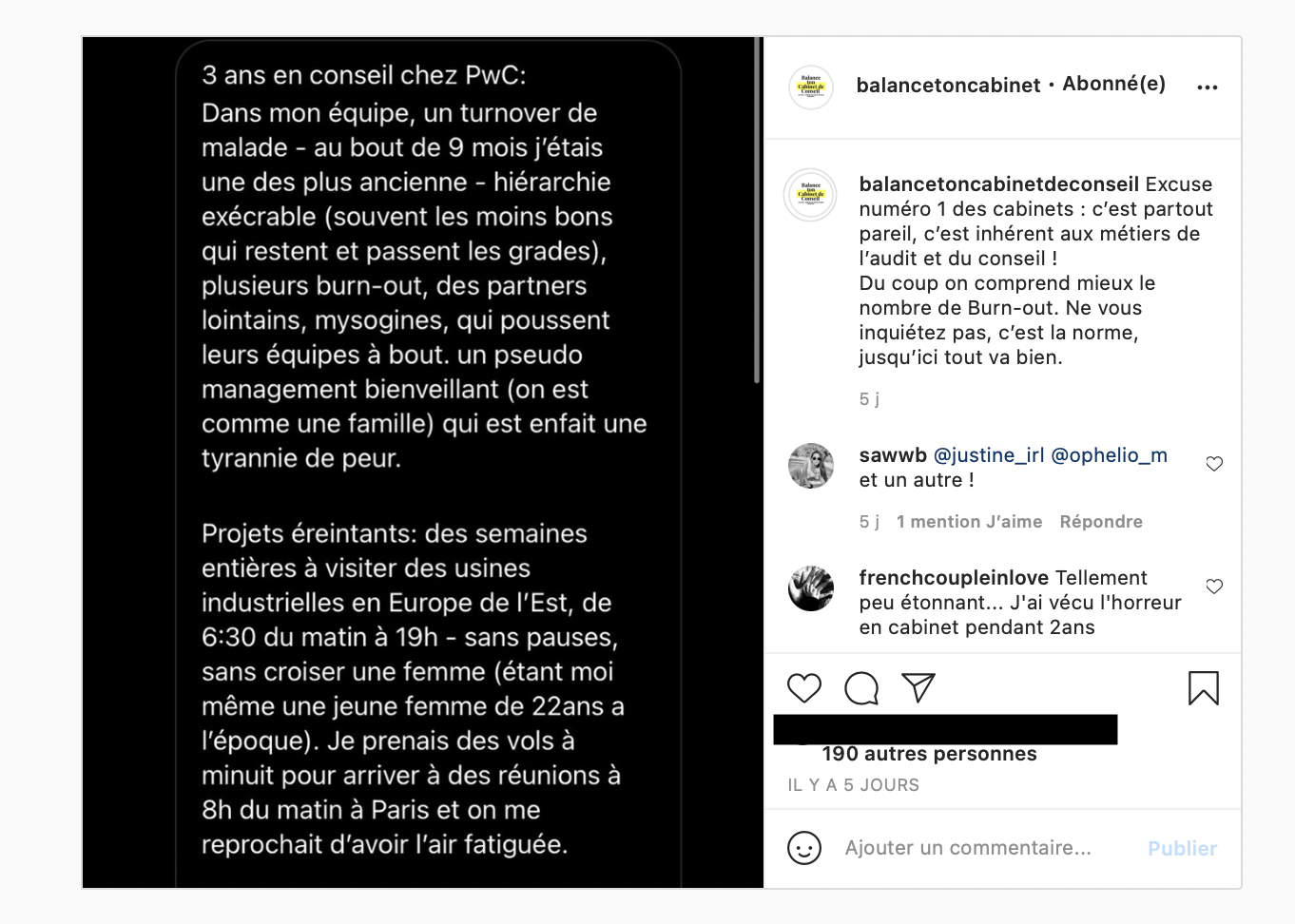 Dans ces univers très verrouillés, l'anonymat est la seule issue. "Les détracteurs de l'anonymat crient aux tribunaux des réseaux sociaux et à la délation, relève Elise Fabing, avocate en droit du travail au barreau de Paris, et qui conseille ces comptes. Mais ils oublient la réalité du rapport de force salarial et la subordination économique. Pour avoir une audience de jugement à Nanterre aux prud'hommes, c'est 45 mois d'attente. Quand vous avez la trésorerie d'un Big four, y a pas de souci. Si vous êtes un salarié..." Ajoutez les ordonnances Macron qui ont plafonné les indemnités prudhommales, ce qui permet aux entreprises de budgétiser leurs licenciements. Même abusifs.