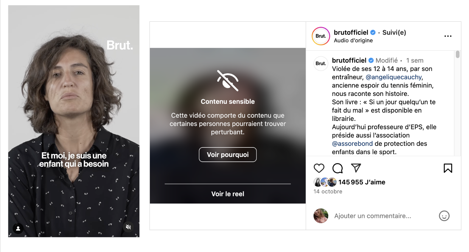 "Ma vidéo Brut a été signalée puis floutée. Les violences sexuelles ne doivent pas être tues." La déclaration est un cri d'indignation, sur Instagram, de la tenniswoman et autrice Angélique Cauchy. Le pureplayer vidéo Brut l'a interviewée la semaine dernière, pour son récent livre Si un jour quelqu'un te fait du mal (Stock). Dedans, Angélique Cauchy raconte les 400 viols que lui a fait subir, enfant, son entraîneur. Première phrase de la vidéo Brut : "Sur quinze jours, j'ai dû subir entre 45 et 50 viols". Un logo "attention contenu sensible" clignote en haut à gauche. La vidéo a fait 4 millions de vues en 36 heures sur Instagram et 6 millions sur TikTok. Instagram l'a floutée. Impossible, depuis, de voir le nombre de vues.