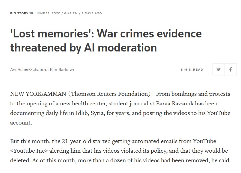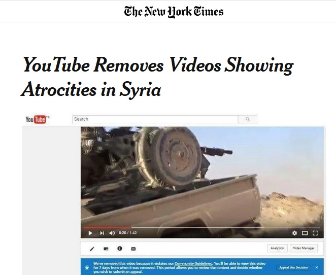 Si 2017 est une année-charnière dans la reconnaissance du citizen journalism comme outil juridique, elle marque aussi le moment où la modération de contenu change radicalement. En août, le New York Times révèle que le nouveau système de modération de YouTube, qui passe d'un réseau de vérificateurs humains à un processus automatisé, fait disparaître les relais habituels de l'information syrienne. Près de 900 comptes disparaissent, dont ceux des médias Bellingcat, Airwars