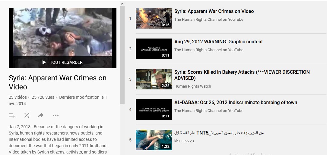 Matière première de choix pour une nouvelle génération de journalistes, les vidéos traquées par les plateformes pèsent également dans le processus judiciaire d'attribution de crimes de guerre. Dès 2011, plusieurs ONG les récupèrent pour monter des dossiers; en 2013, l'ONG Witness assure que les vidéos de "journalistes citoyens" peuvent constituer des preuves devant un tribunal, à condition d'être clairement authentifiables (sur YouTube, Witness dispense aujourd'hui des tutoriels pour apprendre aux activistes à filmer). En 2017, après plusieurs échecs, l'International Criminal Court (ICC) émet un premier mandat d'arrêt international contre le commandant libyen Mahmoud al-Werfalli, s'appuyant notamment sur une vidéo publiée sur Facebook qui le montrerait en train d'exécuter 10 prisonniers. Aujourd'hui, l'ICC et les Nations Unies ont chacune des groupes de travail dédiés à la récolte de preuves de crimes de guerre en ligne. En Allemagne, où les tribunaux peuvent s'autosaisir en vertu de la compétence universelle, l'ONG Syrian Archive travaille avec des avocats, particulièrement sur les bombardements chimiques d'al-Lataminah et Douma, explique son fondateur Hadi al-Khatib en 2018.