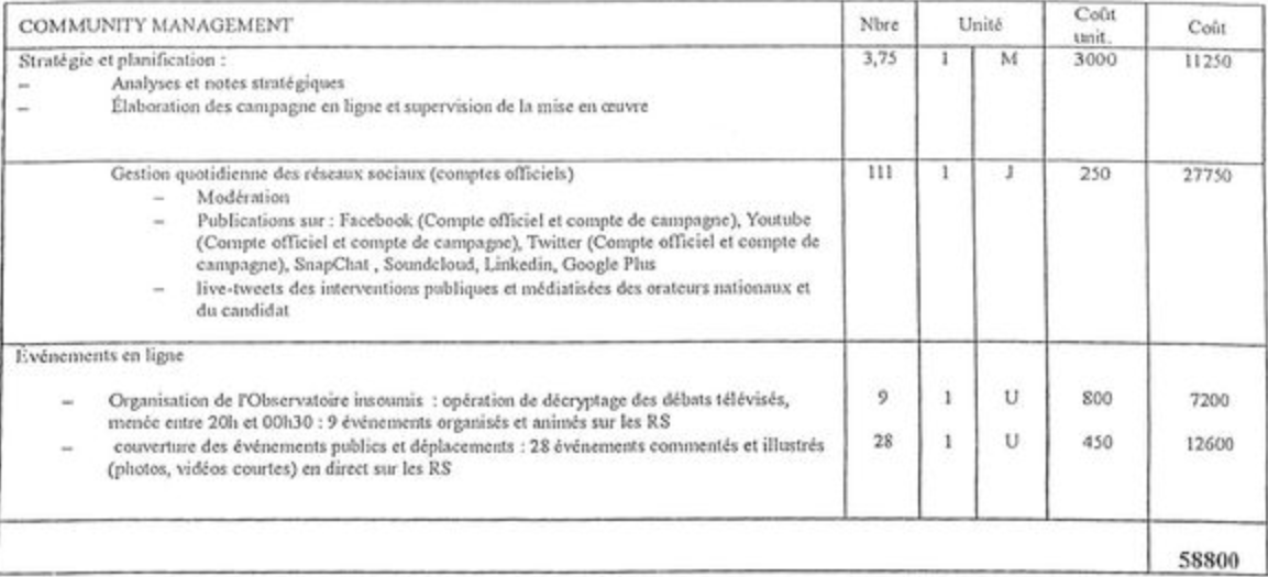 Autre prestation soulevant des interrogations : le community management, c'est-à-dire la gestion de la campagne de Mélenchon sur les réseaux sociaux. Selon Tronchet, cette mission a été réalisée par trois salariés, dont deux rémunérés par Mediascop et un autre recruté au statut d'auto-entrepreneur. Il apparaît que pour ce travail s'étalant sur quatre mois, fragmenté en diverses tâches, le coût a atteint les 58 800 euros au total. "Or, on a consulté des sociétés classiques qui proposaient des tarifs inférieurs"
