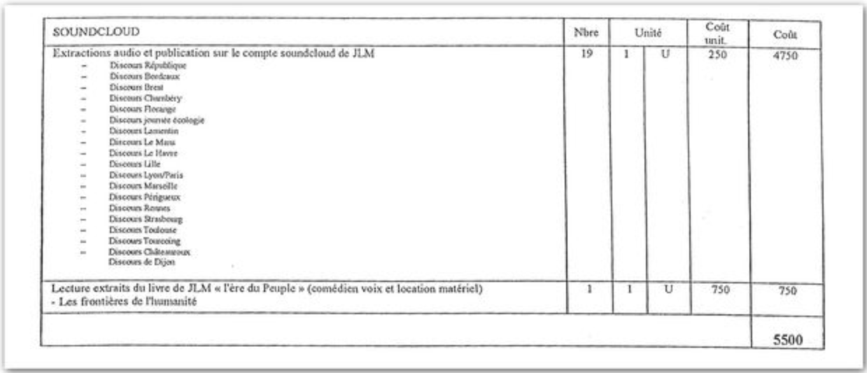 de Mélenchon, sur la plateforme Soundcloud, facturée à 250 euros l'unité. Ainsi l'extraction et la mise en ligne de 19 discours de Mélenchon sur Soundcloud représentent un coût total de 5 500 euros. Exorbitant, estime Radio France, pour qui "cette opération prend 5 à 10 minutes"