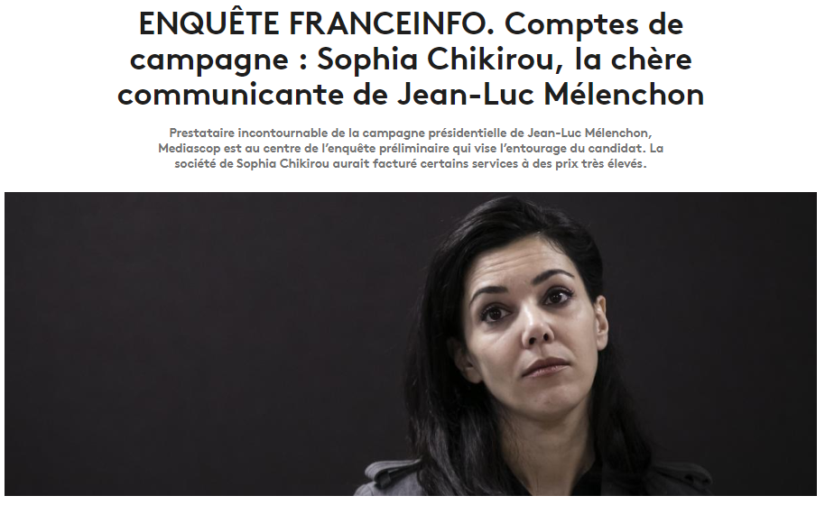 Mise en ligne des discours de Mélenchon, gestion des réseaux sociaux, sous-titrage de vidéos à 200 euros la minute : la communicante Sophia Chikirou a-t-elle facturé très cher ces prestations au cours de la campagne présidentielle de 2017 ? C'est ce qu'a affirmé, vendredi 19 octobre, factures à l'appui, la cellule investigation de Radio France, déchainant un feu roulant médiatique. Ces révélations intervenaient quelques jours après les méga-perquisitions ultra-médiatisées visant notamment La France Insoumise (LFI) et le domicile de Jean-Luc Mélenchon, dans le cadre d'une enquête préliminaire (c'est à dire, dirigée par le procureur) sur ses comptes de campagne.