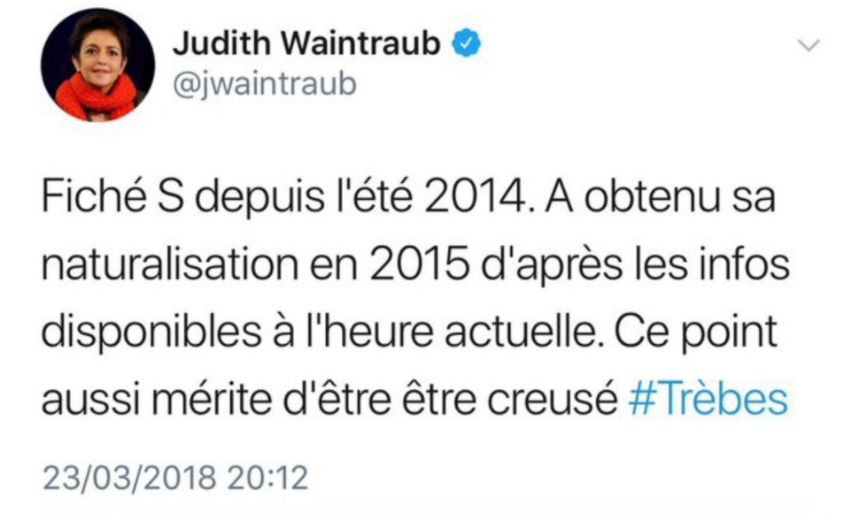 Une fake news, d'abord. BFM TV a diffusé à l'antenne vendredi 23 mars l'information selon laquelle le terroriste, Radouane Lakdim, aurait été naturalisé en 2015, soit un an après qu'une "fiche S" ait été créée le concernant. Élément relayé par la journaliste du Figaro