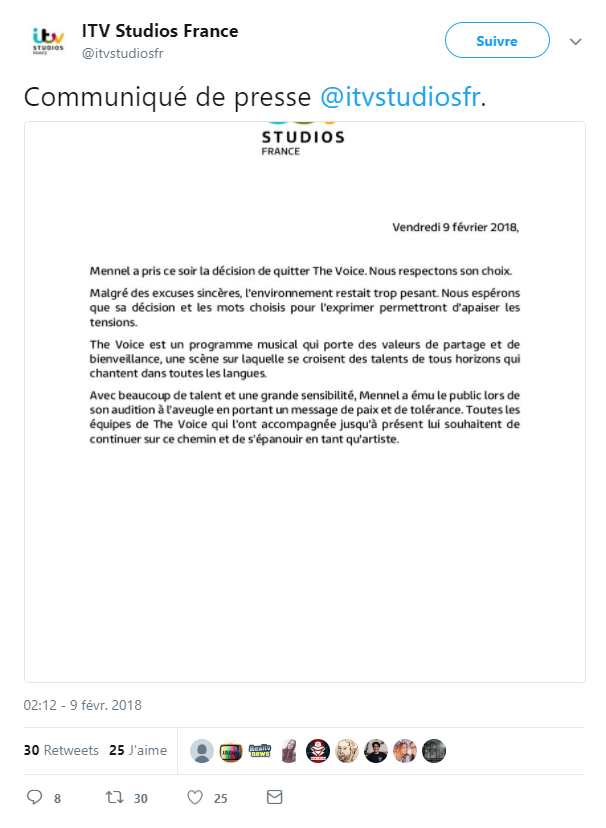 Dans un communiqué diffusé aujourd'hui, ITV Studios France, la production de The Voice, lui souhaite "de s'épanouir en tant qu'artiste",