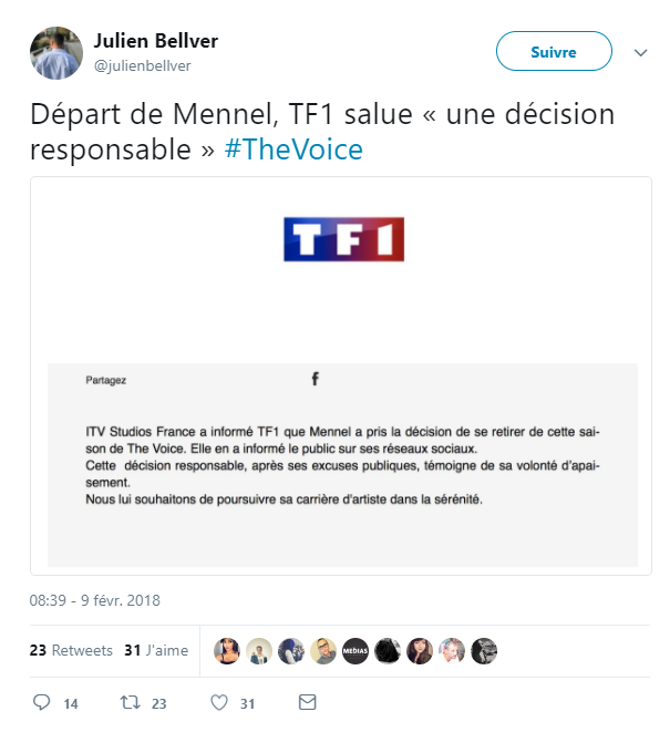 Relayée sur Twitter par Julien Bellver, journaliste de Quotidien (TMC), la réaction de TF1 est nettement moins élogieuse, reconnaissant seulement une "décision responsable" et souhaitant à Mennel "sérénité" dans sa carrière.
