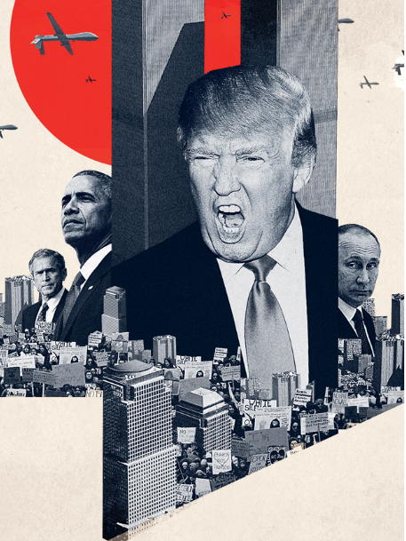 , on peut également voir une illustration montrant un Trump vociférant devant les tours jumelles, dont s'approche un drone. On pourrait multiplier les exemples.