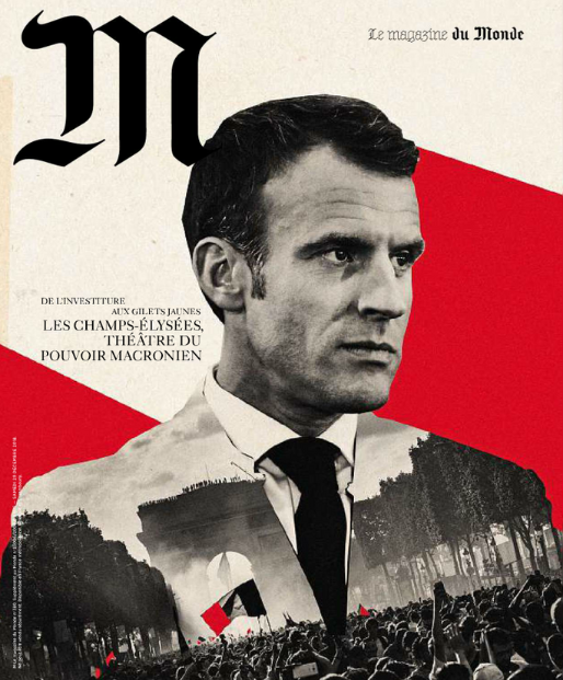 Emmanuel Macron est de trois-quarts, le visage fermé, en noir et blanc. Sur sa veste se reflète l'Arc de Triomphe, écrasé par une foule qui agite des drapeaux, effacés en partie par la fumée. Derrière le président, des bandes rouges et blanches balafrent la couverture. C'est peu dire que la Une du magazine du Monde