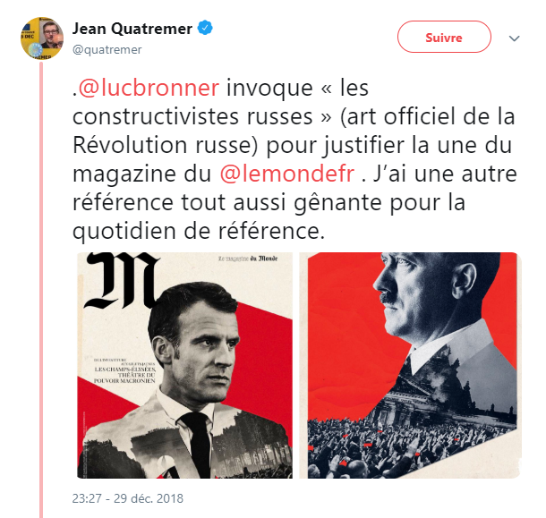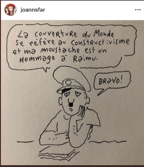 se partageant entre ceux qui ne croient pas à "l'alibi" russe, et ceux qui estiment qu'un graphisme bolchevique, finalement, ne vaut pas mieux qu'un graphisme nazi. Dans la première catégorie, le dessinateur Joann Sfar a ainsi publié une caricature, retweetée comme il se doit par l'éternel Quatremer, montrant Hitler en personne. "La couverture du Monde se réfère au constructivisme et ma moustache est un hommage à Raimu
