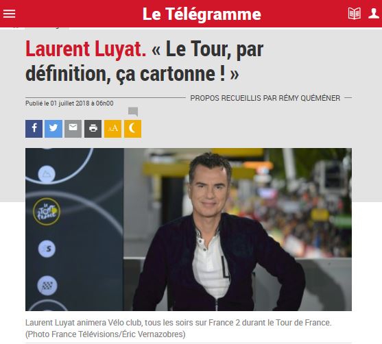 Comme chaque été, France Télévisions est sur la ligne de départ. Prêt pour le coup d’envoi du Tour de France qui s’élance ce samedi de Vendée. En tout 21 étapes, toutes diffusées en intégralité sur la télévision publique. "Par définition le Tour ça cartonne ! Si la course partait à 9h du matin, ça marcherait quand même", s’enthousiasmait en début de semaine dans Le Télégramme le journaliste sportif Laurent Luyat amené cette année encore à animer les étapes sur l’antenne publique.